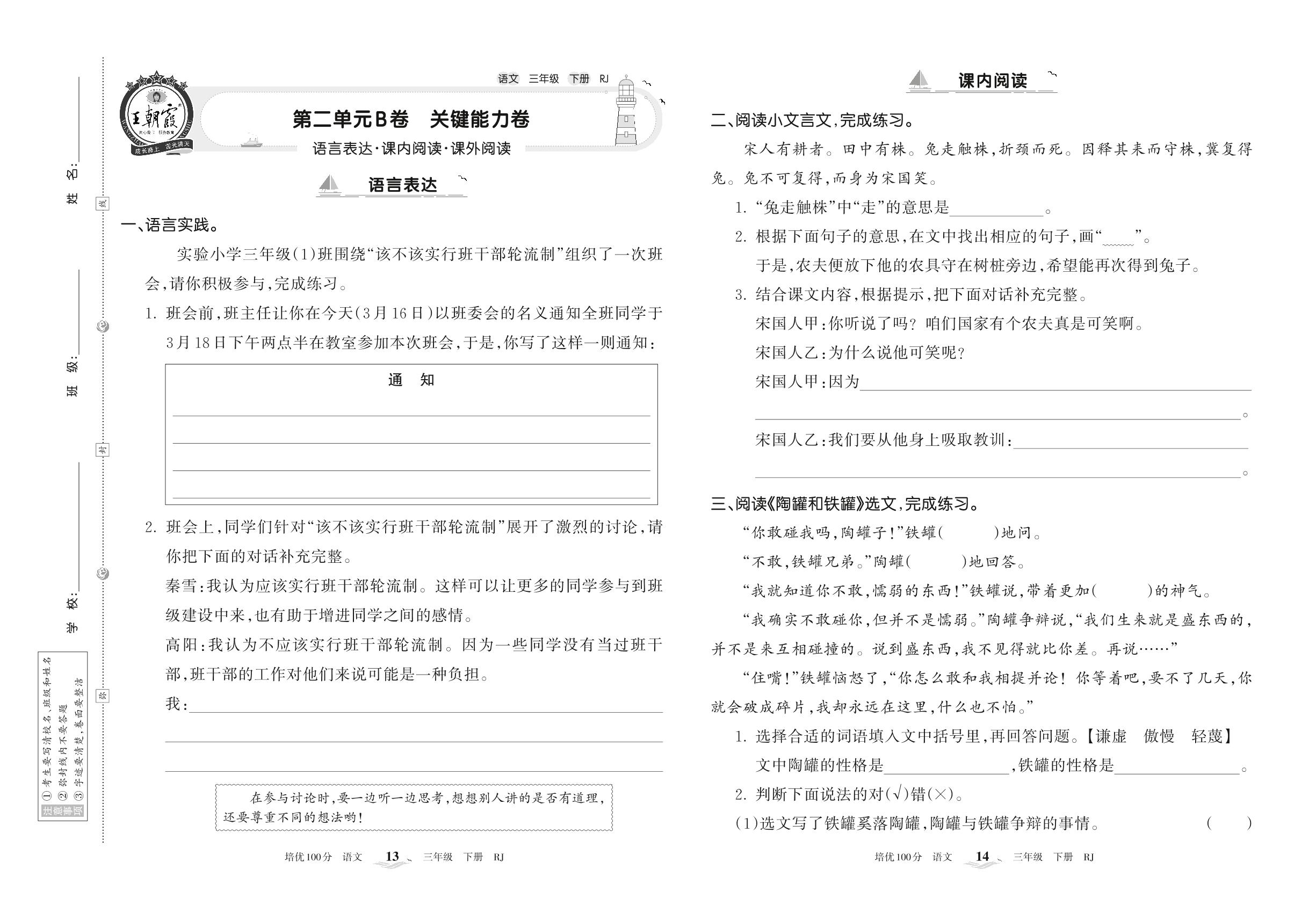 2022下册三年级语文人教版 第二单元B卷 关键能力卷