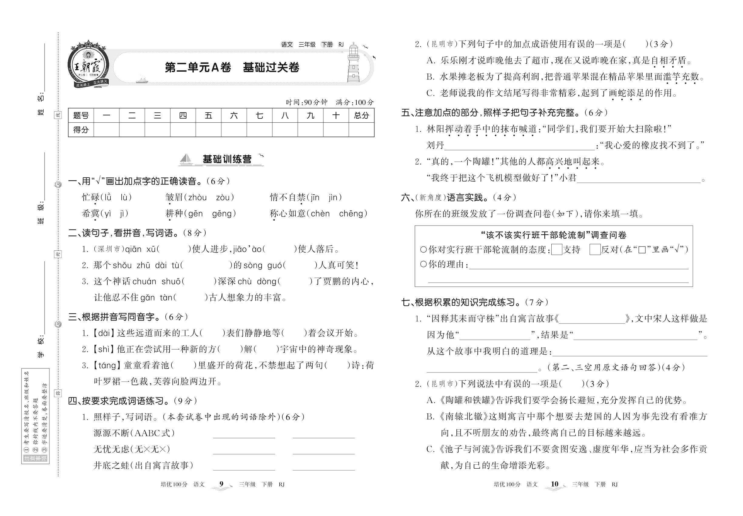 2022下册三年级语文人教版 第二单元A卷 基础过关卷