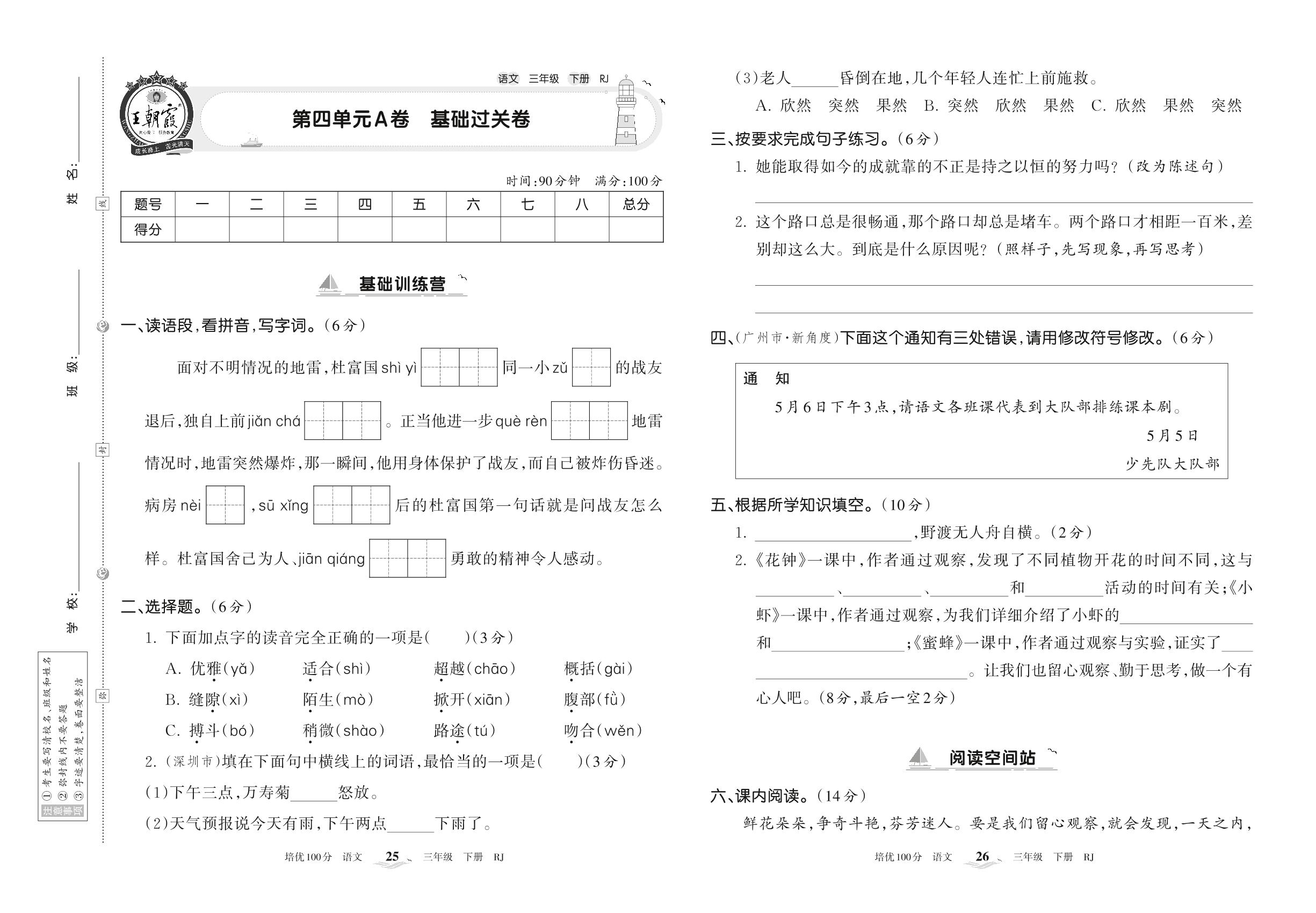 三年级语文人教版下册单元卷