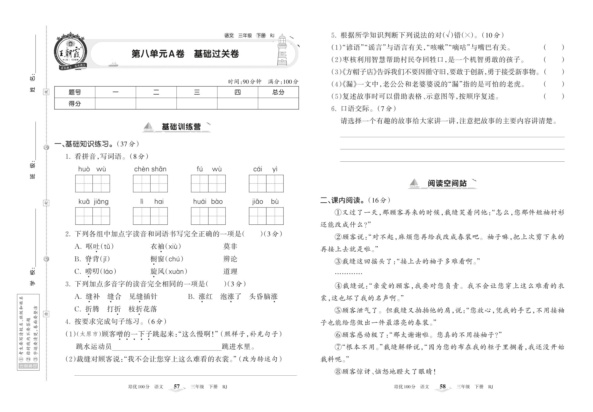 2022下册三年级语文人教版 第八单元A卷 基础过关卷