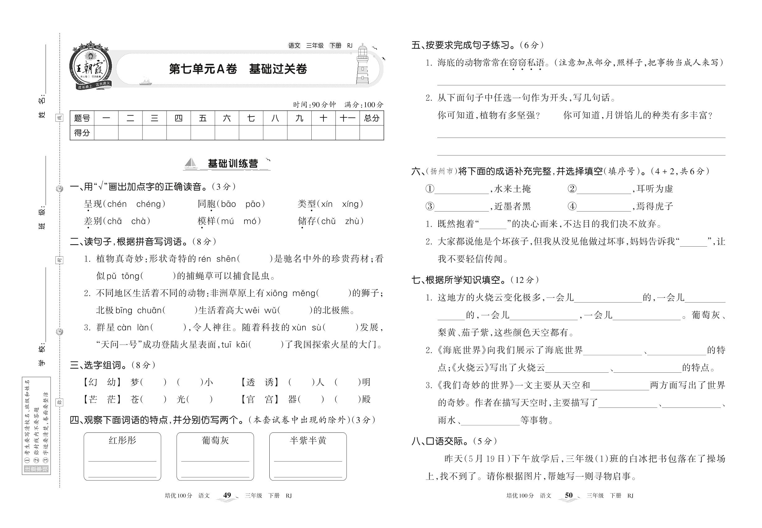 2022下册三年级语文人教版 第七单元A卷 基础过关卷