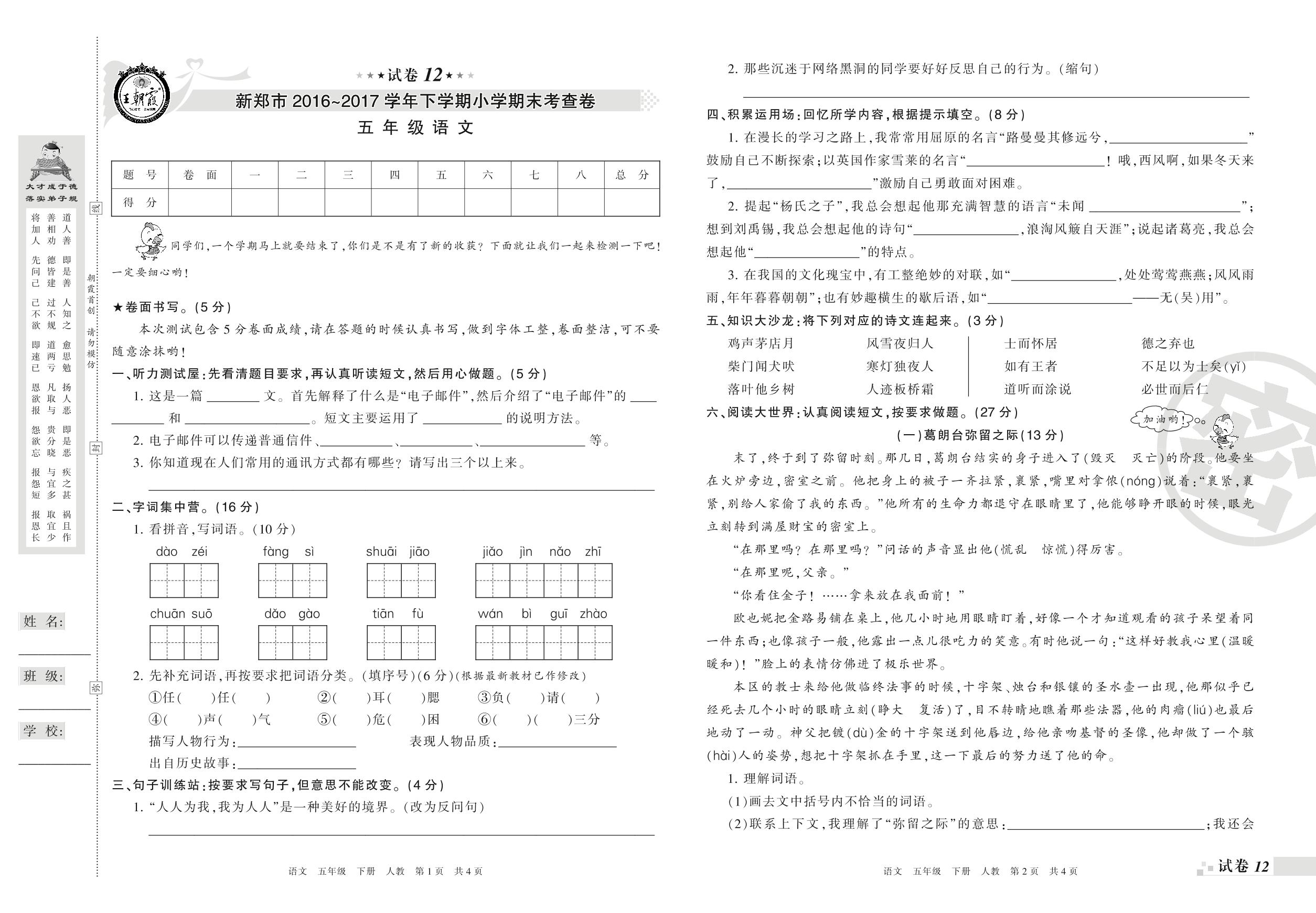 2016-2017学年第二学期新郑市五年级语文试卷(人教版)【12】