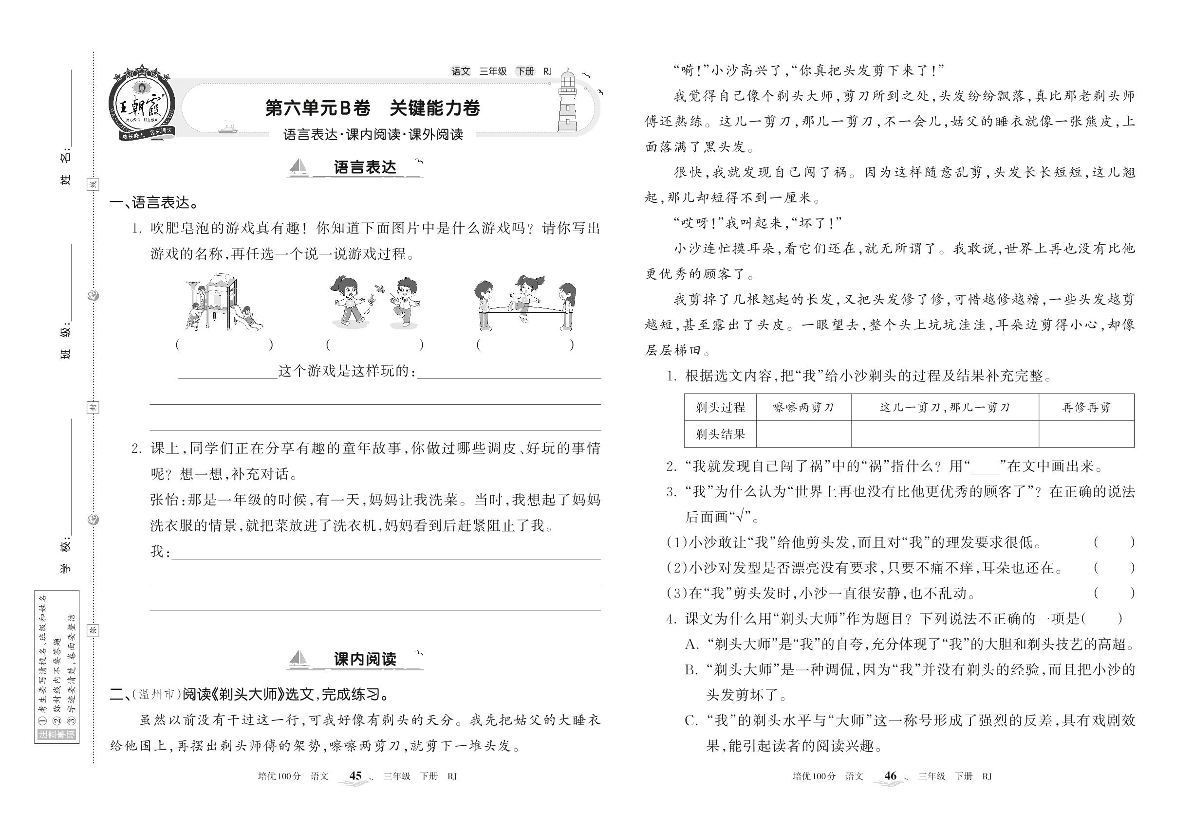 2022下册三年级语文人教版 第六单元B卷 关键能力卷