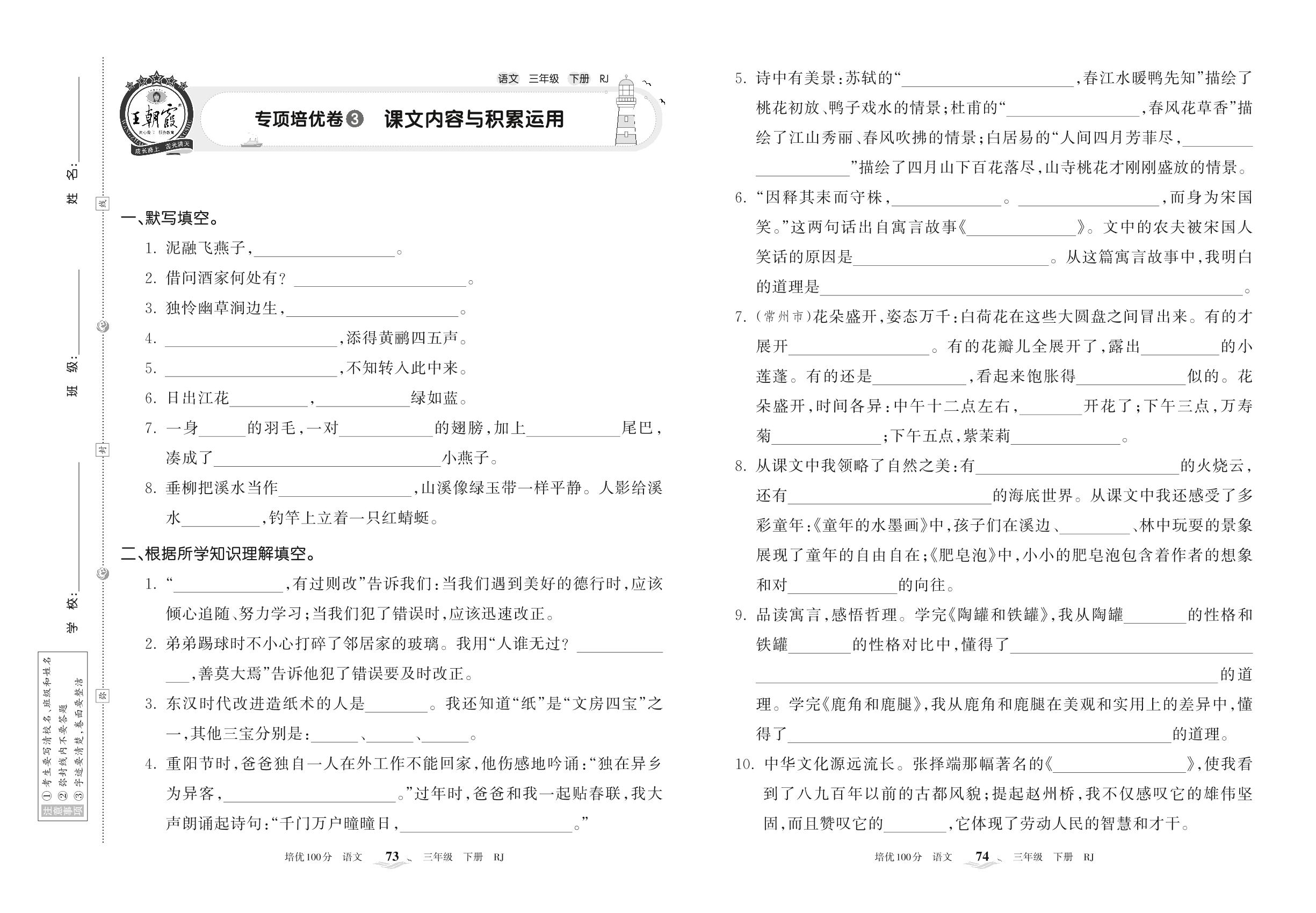 2022下册三年级语文人教版 专项培优卷3 课文内容与积累运用