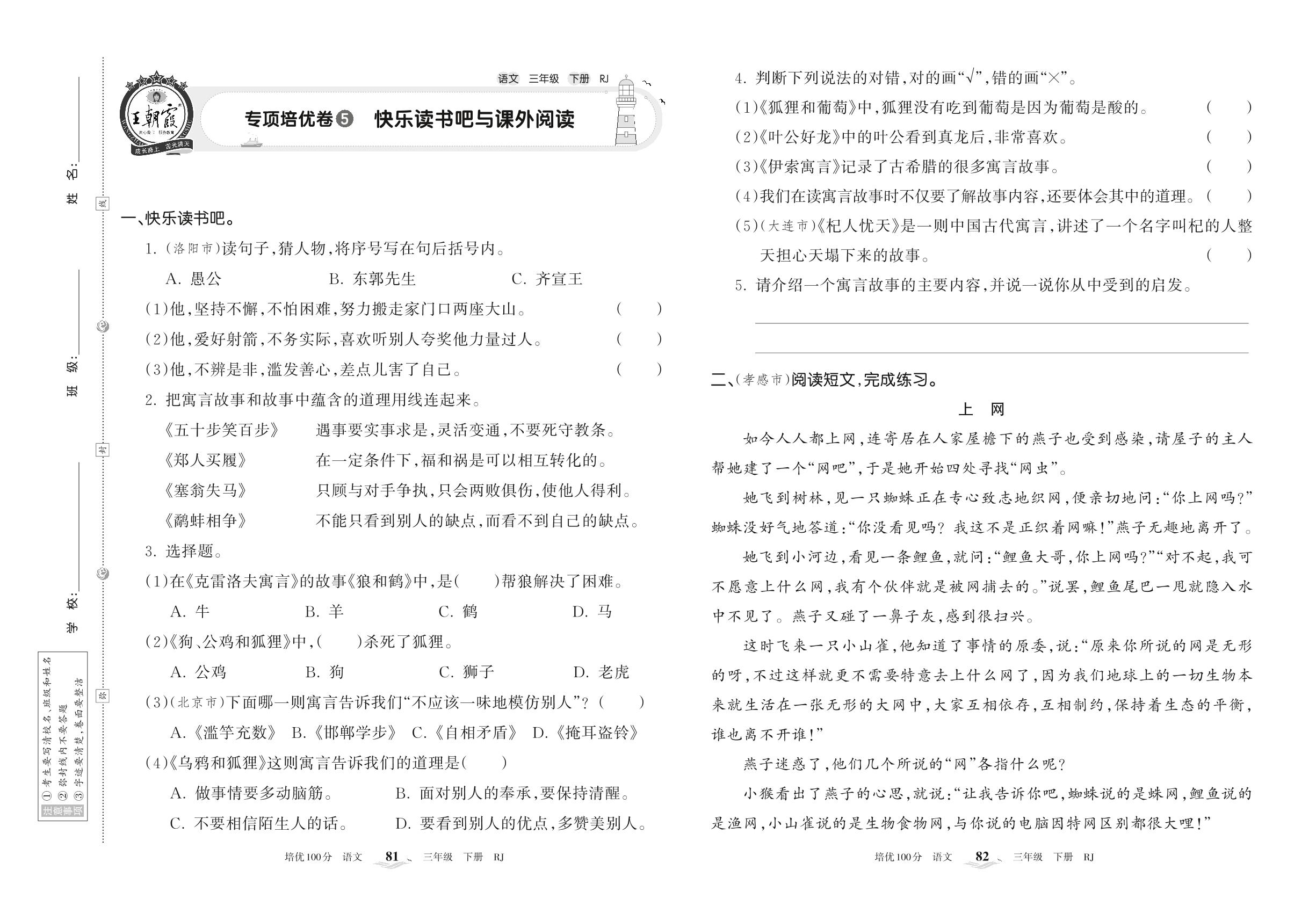 2022下册三年级语文人教版 专项培优卷5 快乐读书吧与课外阅读