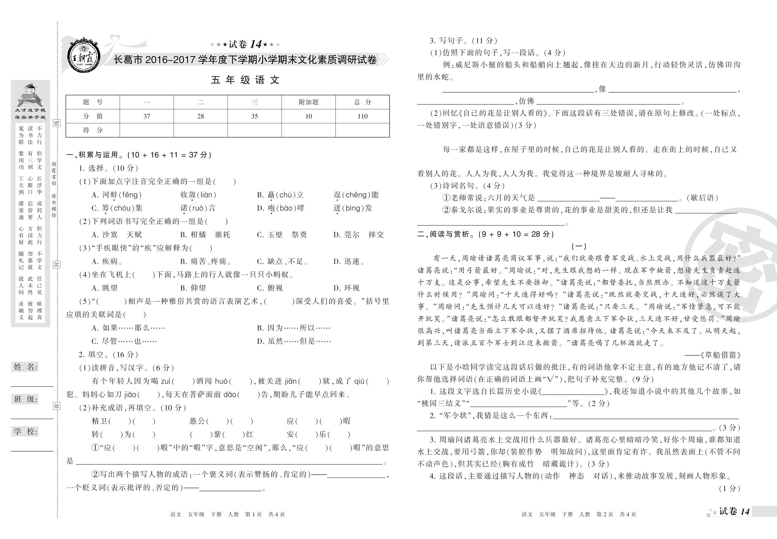 2016-2017学年第二学期长葛市五年级语文试卷(人教版)【14】