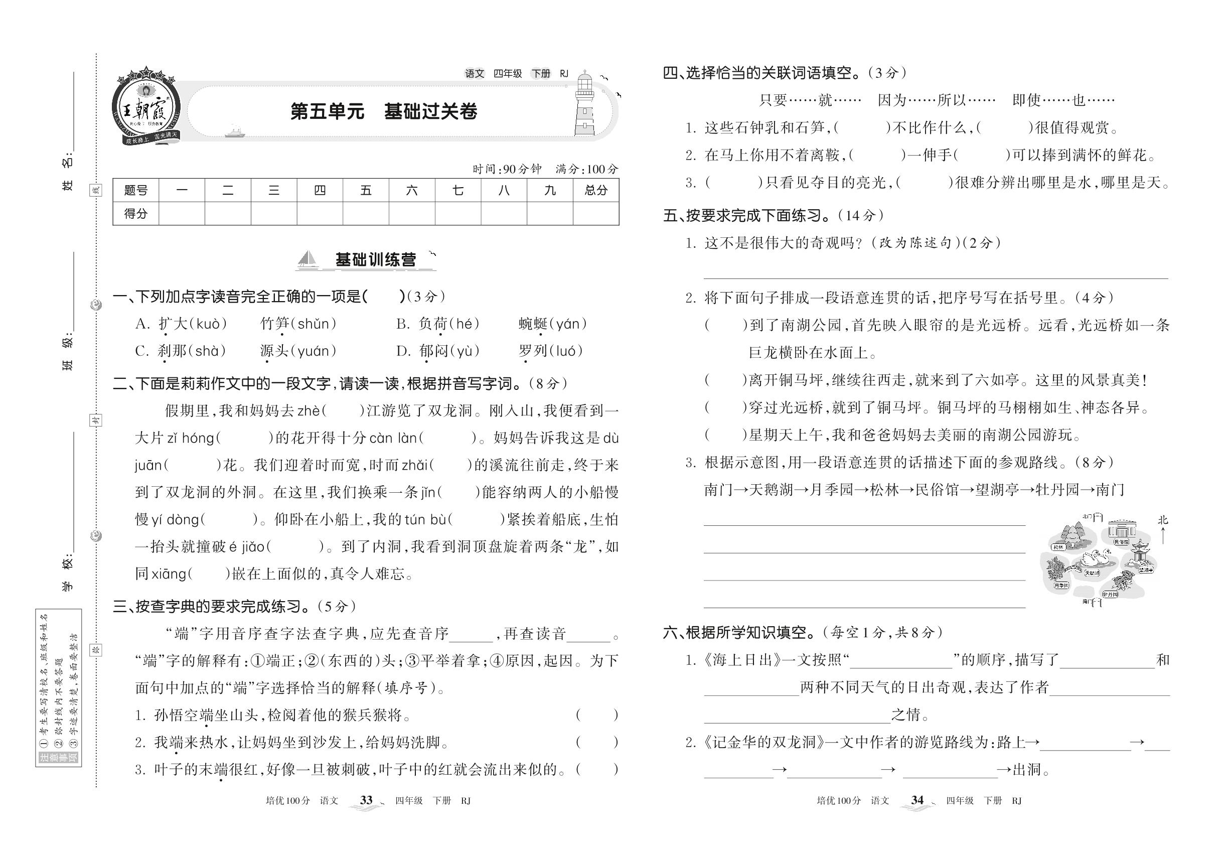 2022下册四年级语文人教版 第五单元 基础过关卷