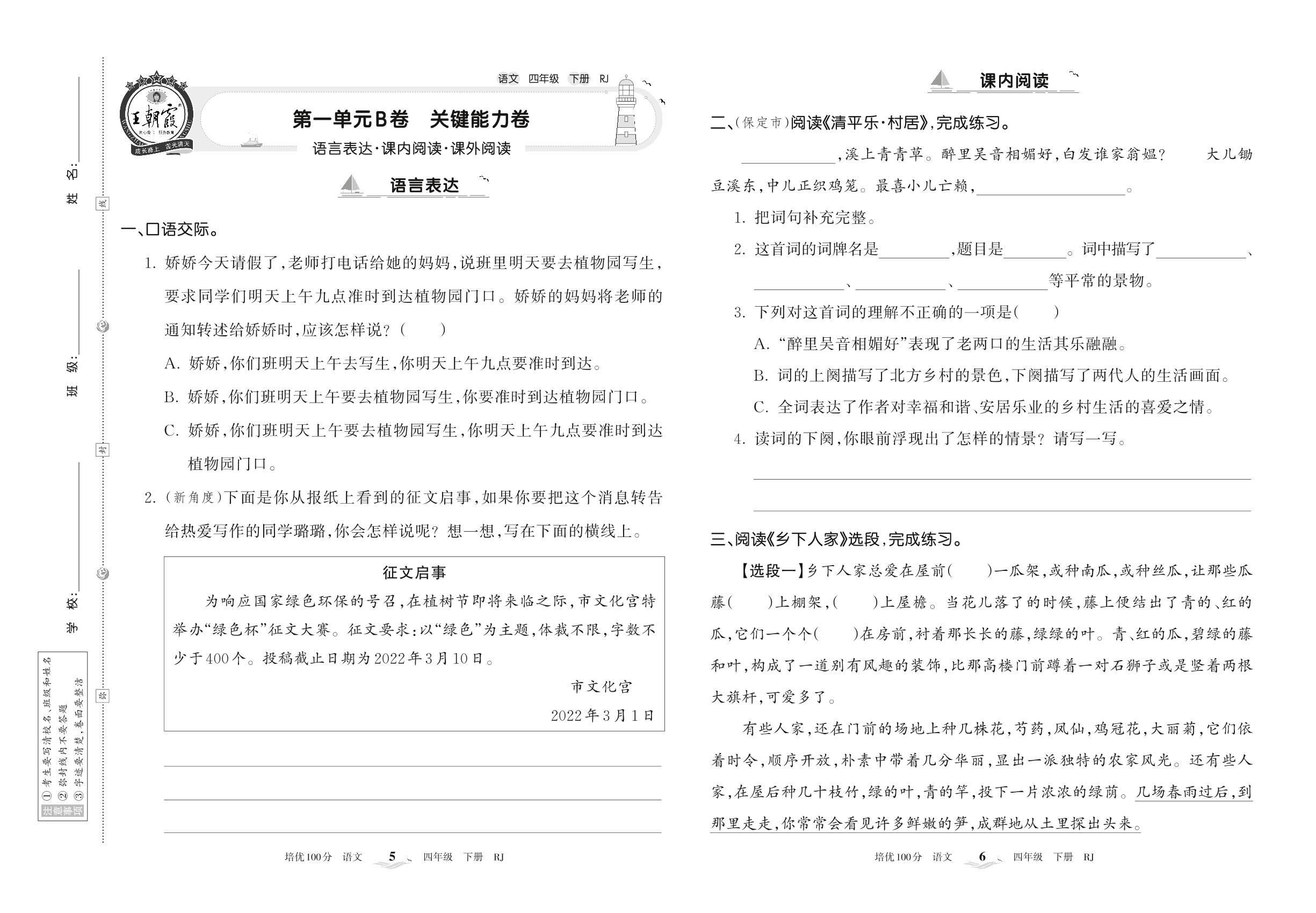 2022下册四年级语文人教版 第一单元B卷 关键能力卷