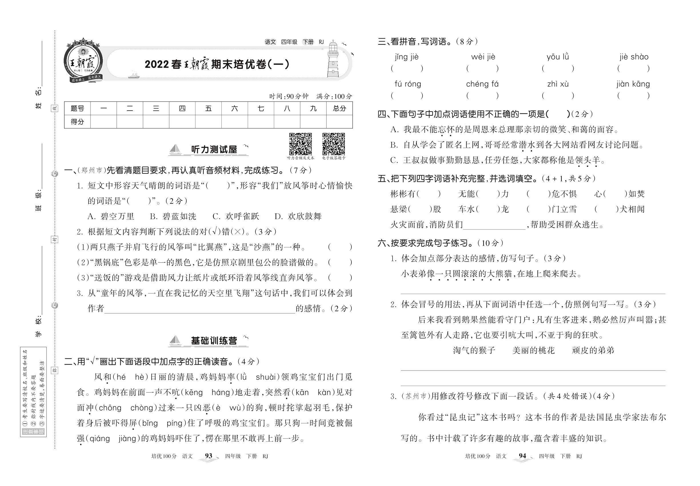 2022下册四年级语文人教版 王朝霞期末培优卷(一)