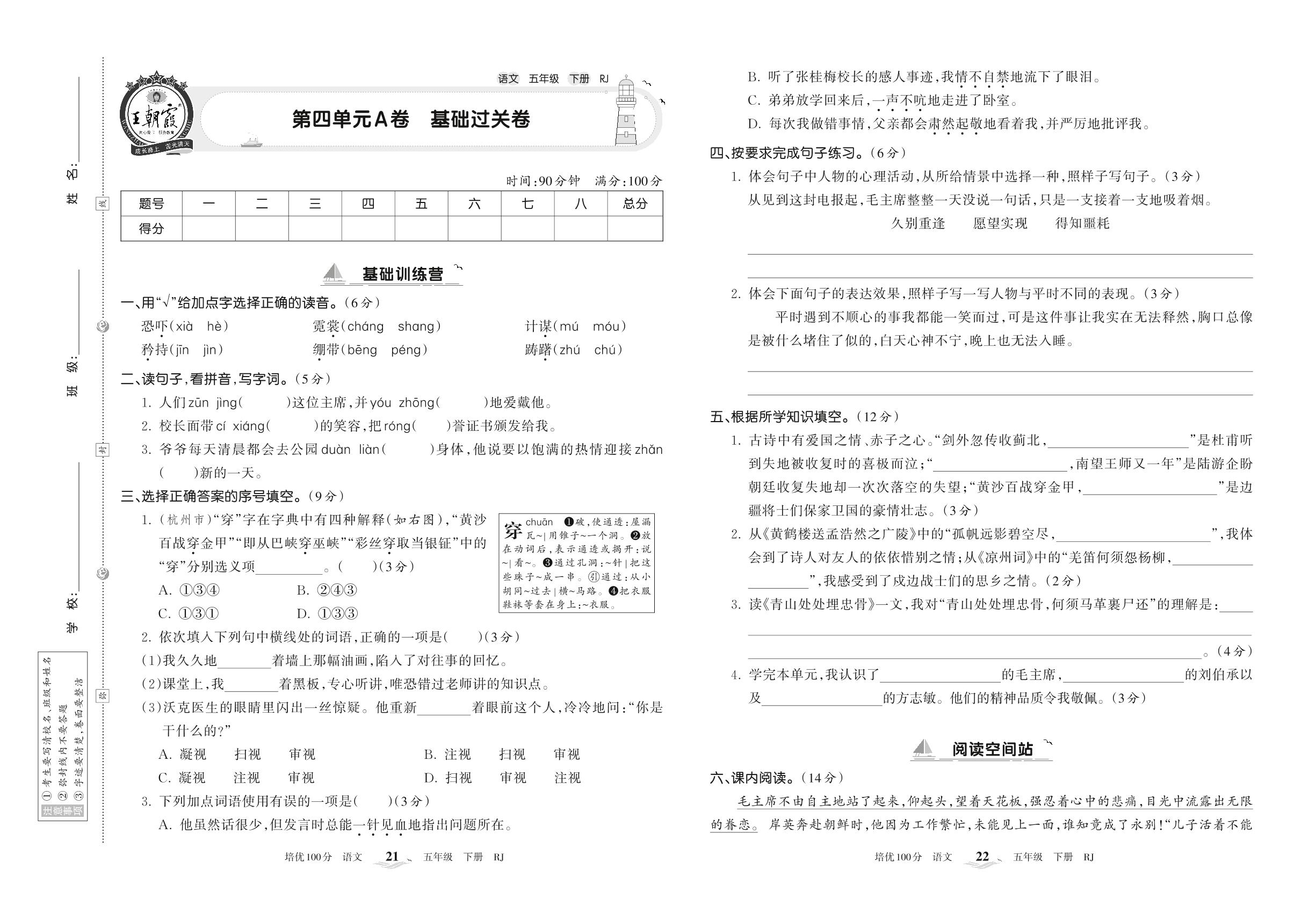 2022下册五年级语文人教版 第四单元A卷 基础过关卷