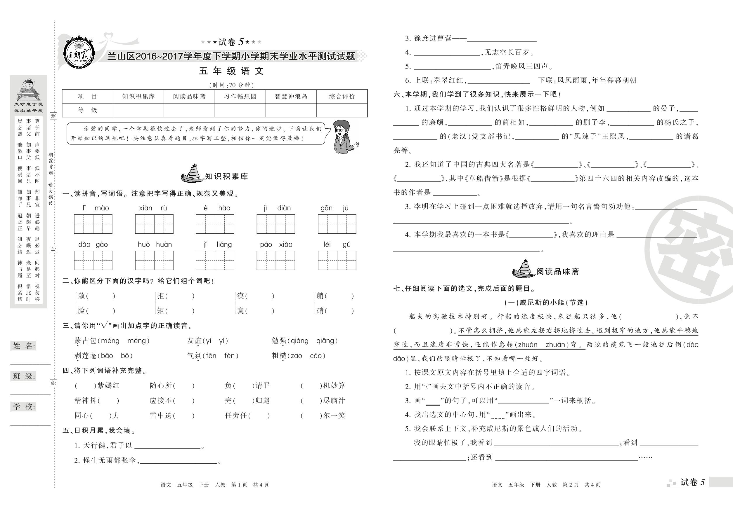 2016-2017学年第二学期临沂市兰山区五年级语文试卷(人教版)【5】