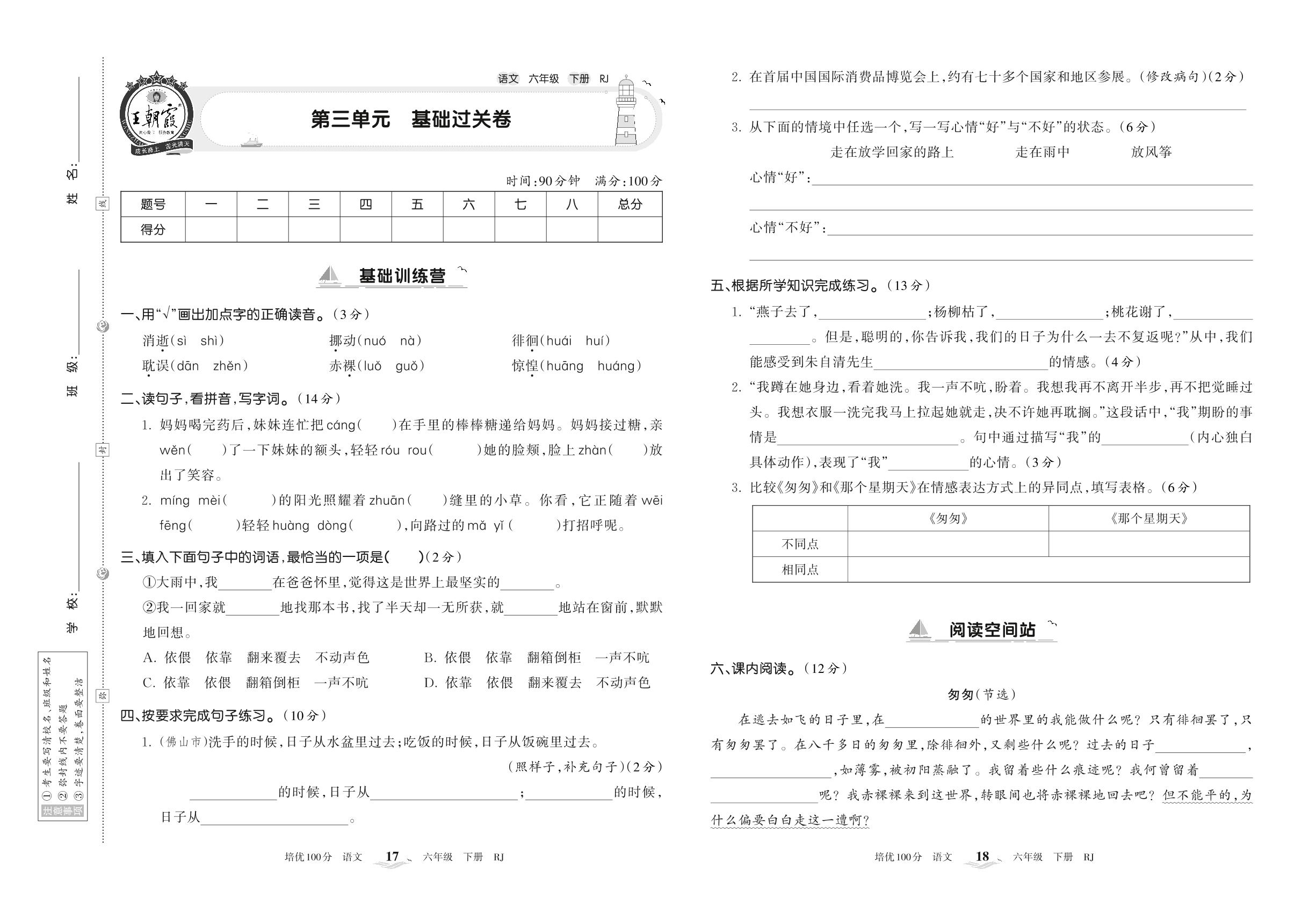 2022下册六年级语文人教版 第三单元 基础过关卷