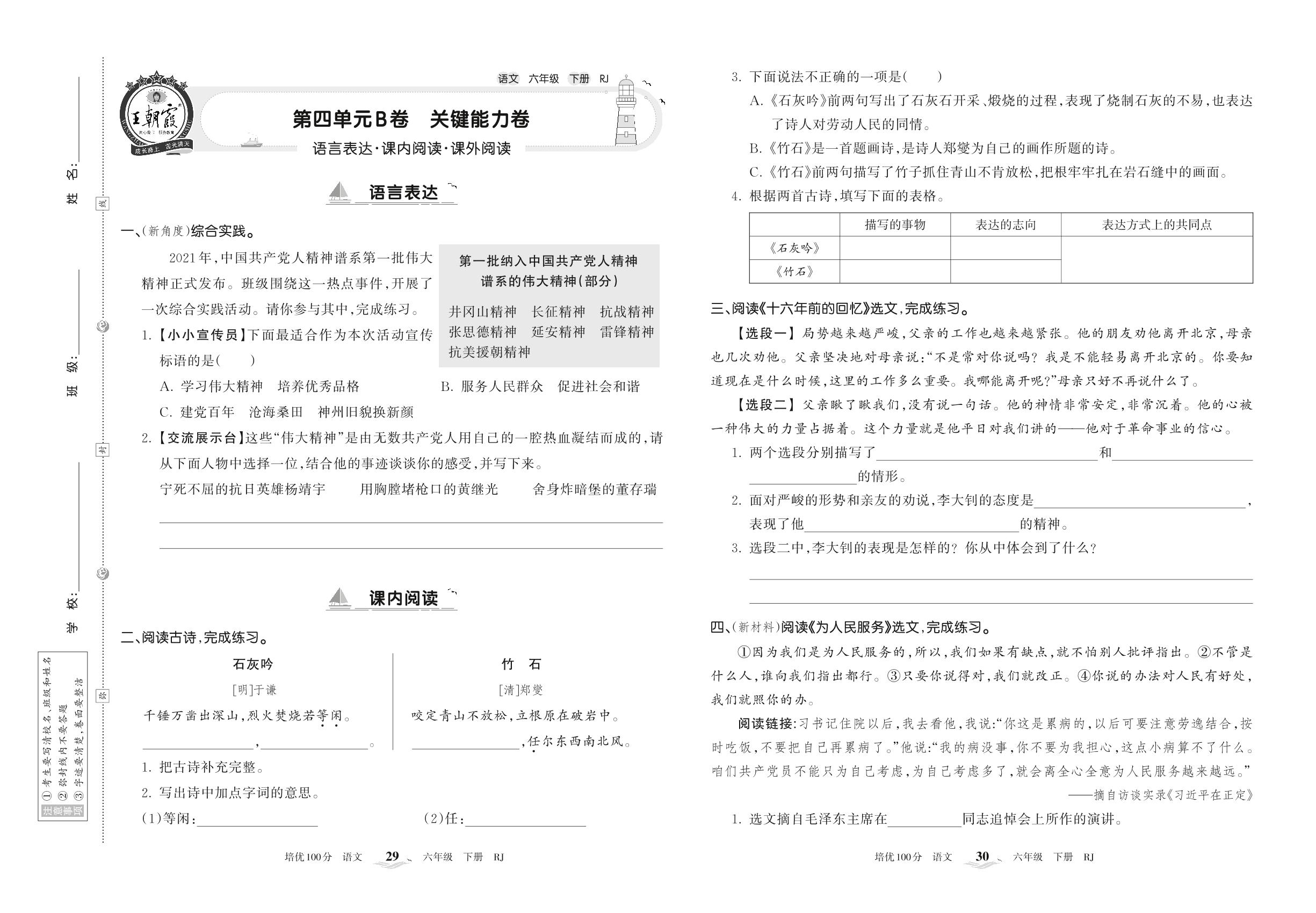 2022下册六年级语文人教版 第四单元B卷 关键能力卷