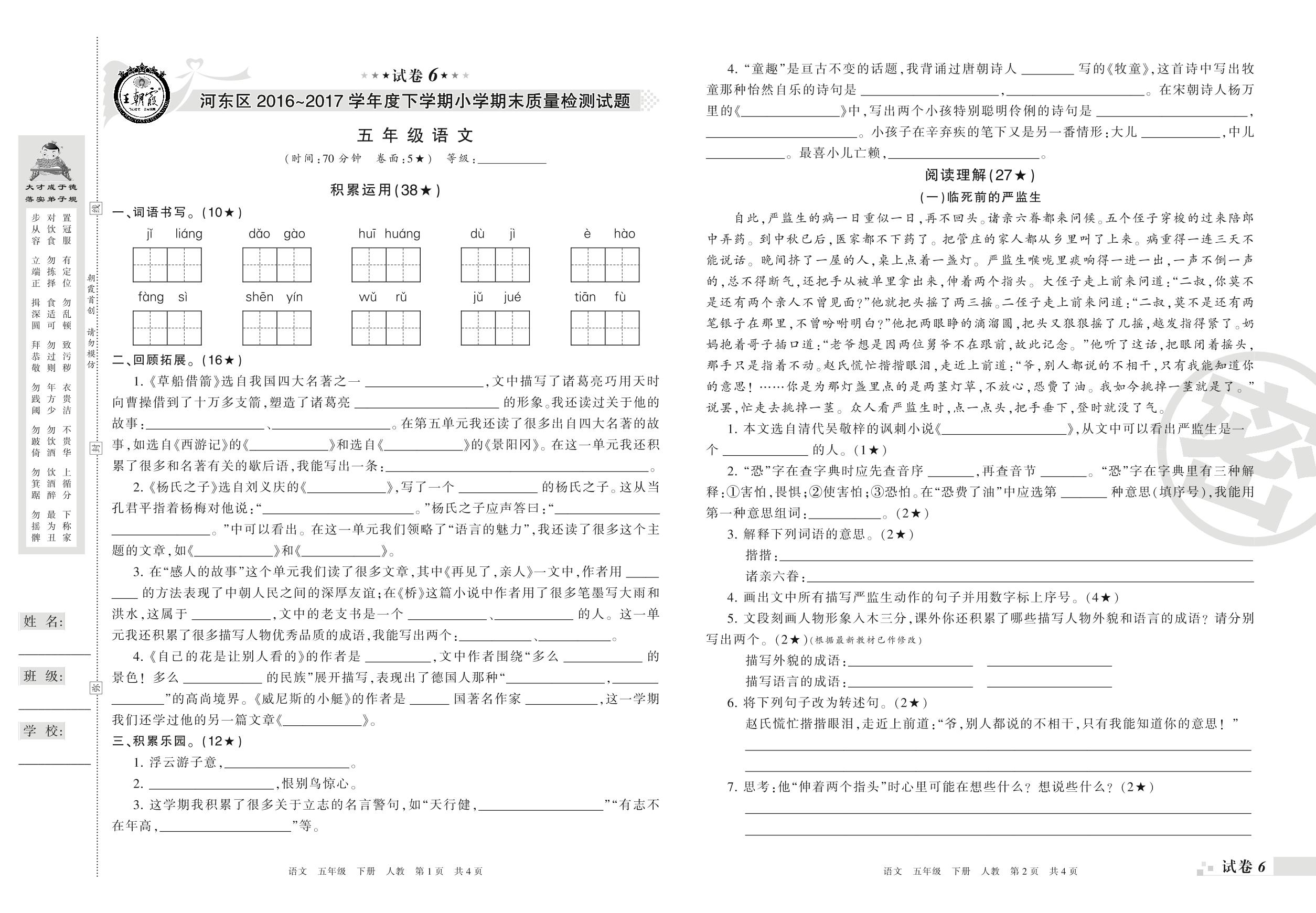 2016-2017学年第二学期临沂市河东区五年级语文试卷(人教版)【6】