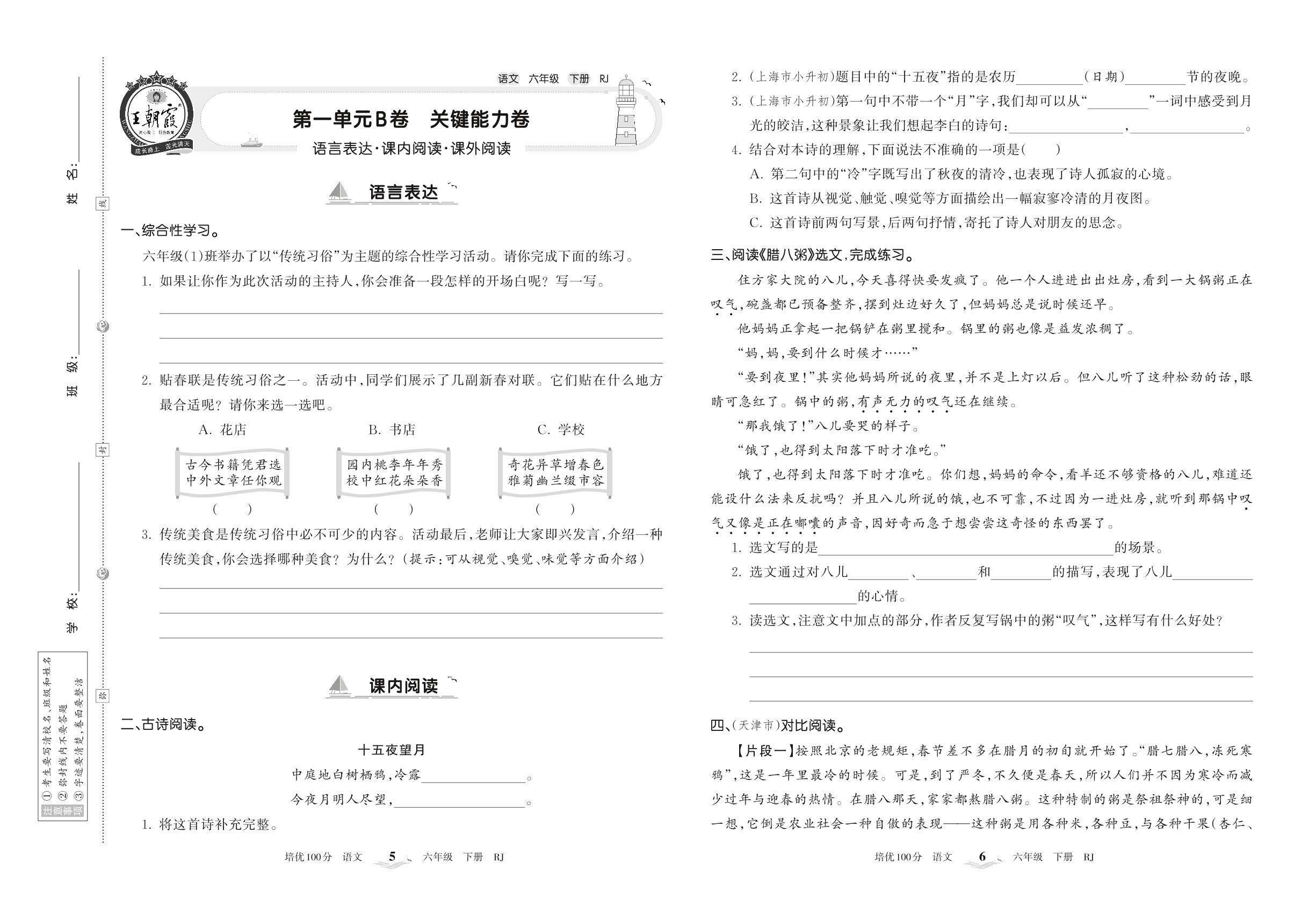 2022下册六年级语文人教版 第一单元B卷 关键能力卷