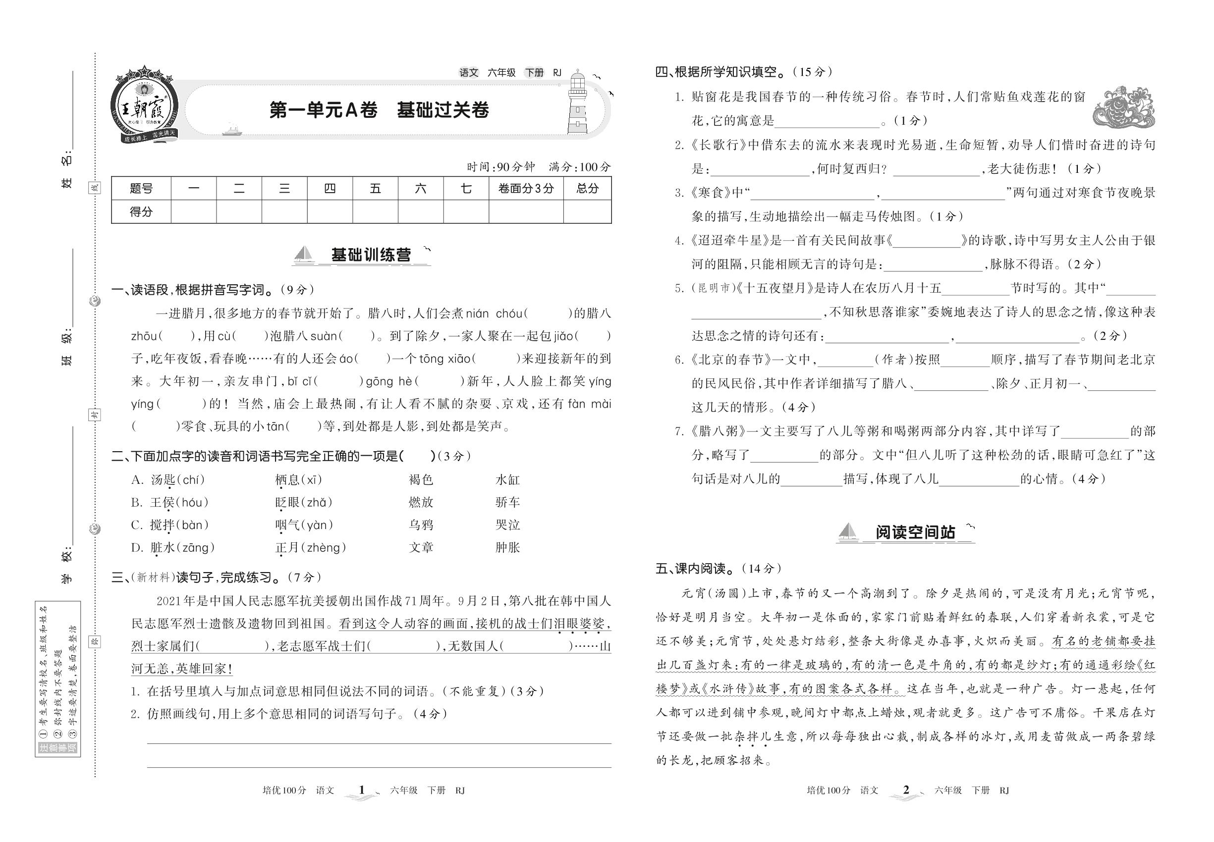 2022下册六年级语文人教版 第一单元A卷 基础过关卷