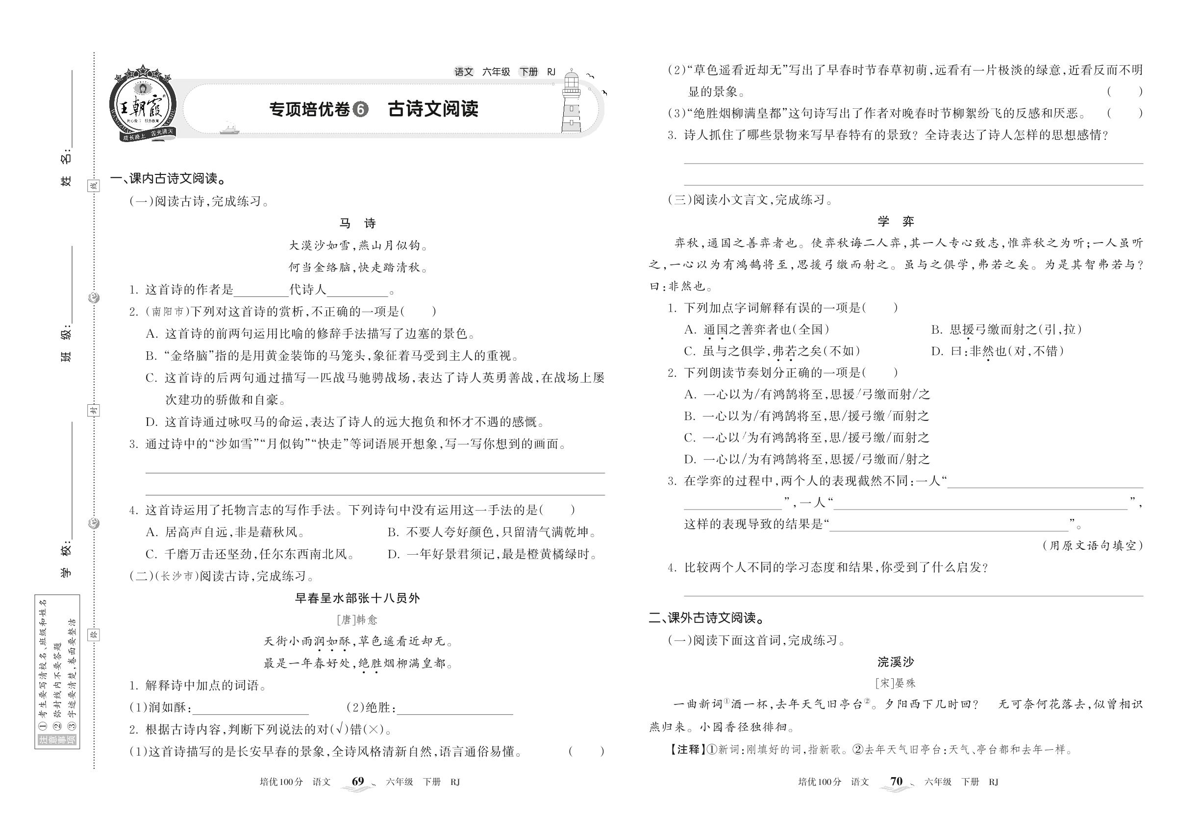 2022下册六年级语文人教版 专项培优卷6 古诗文阅读