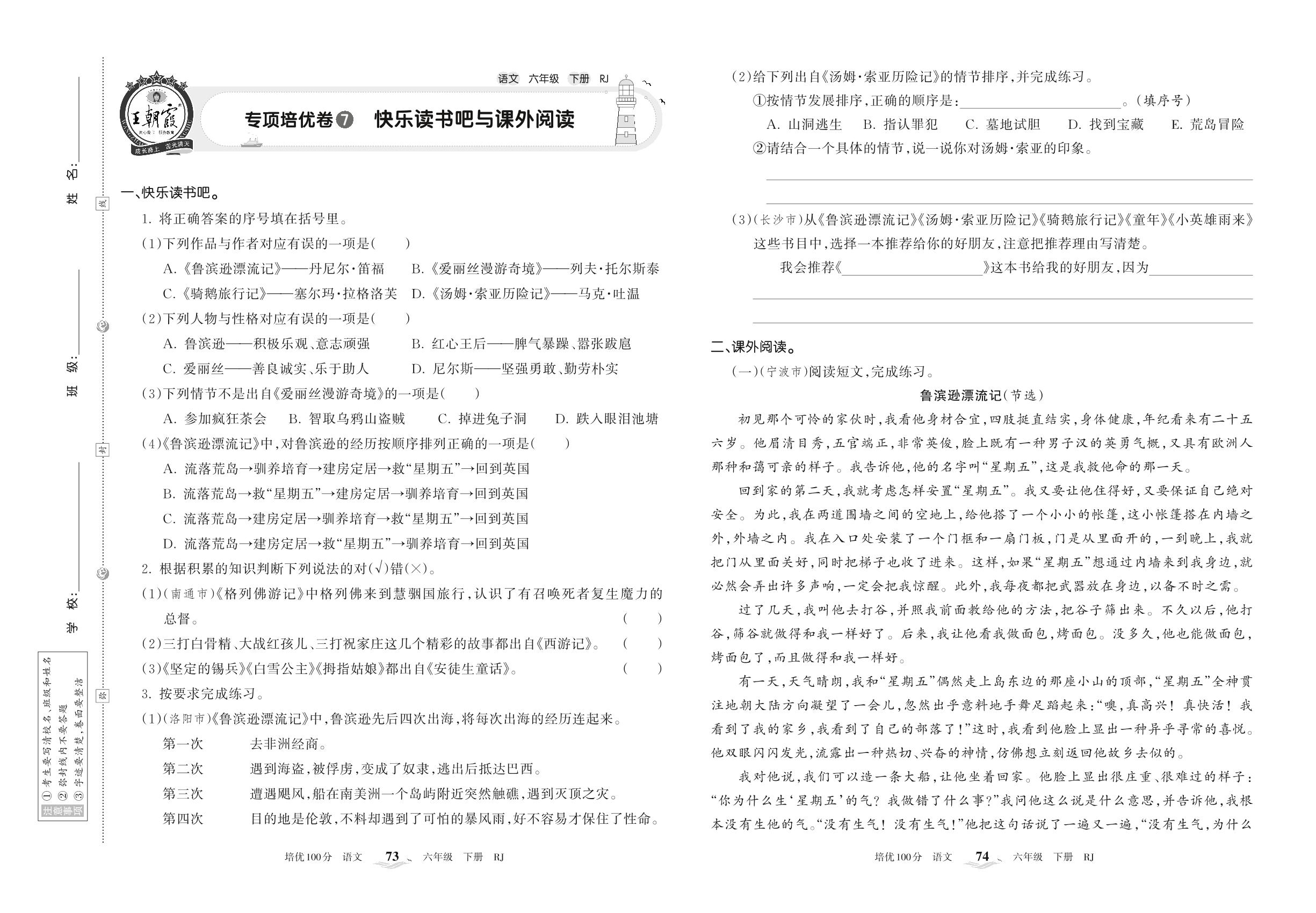 2022下册六年级语文人教版 专项培优卷7 快乐读书吧与课外阅读