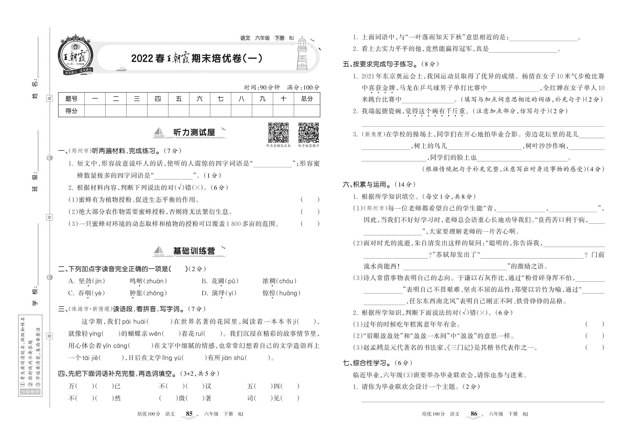2022下册六年级语文人教版 王朝霞期末培优卷(一)