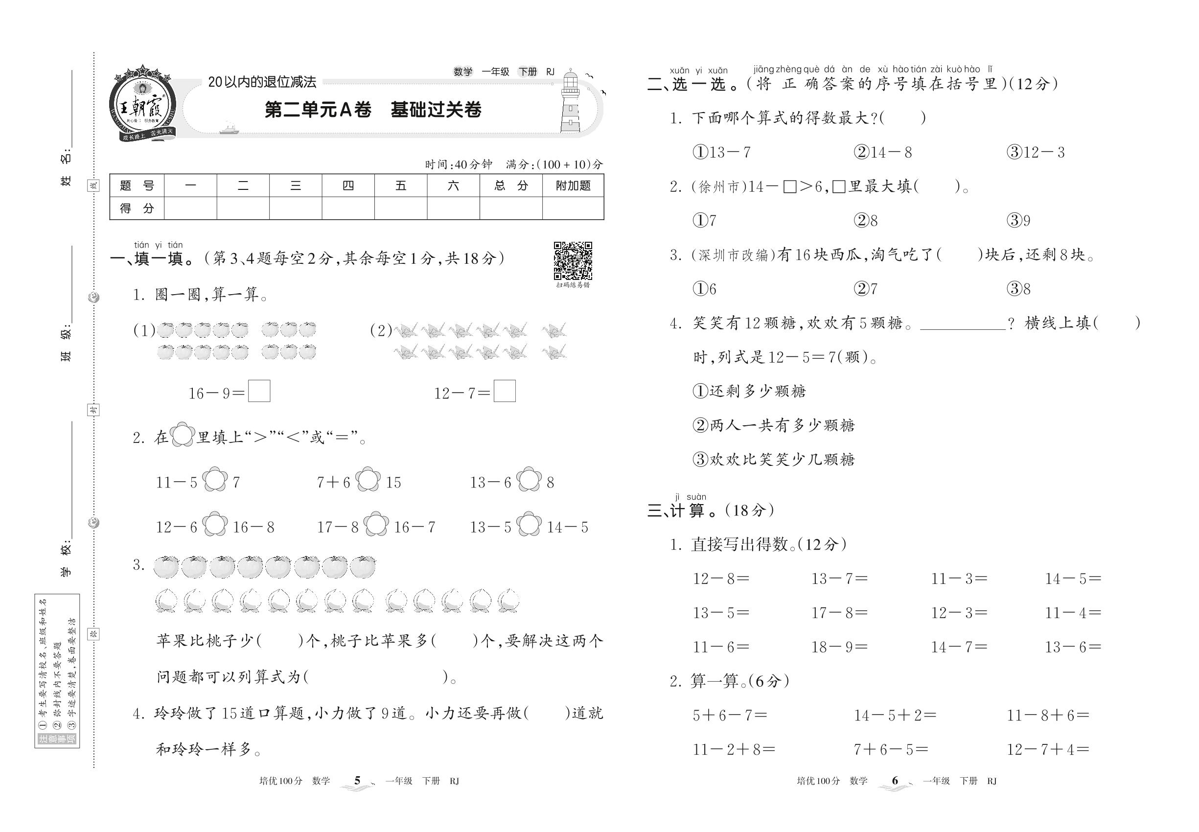 2022下册一年级数学人教版 第二单元A卷 基础过关卷