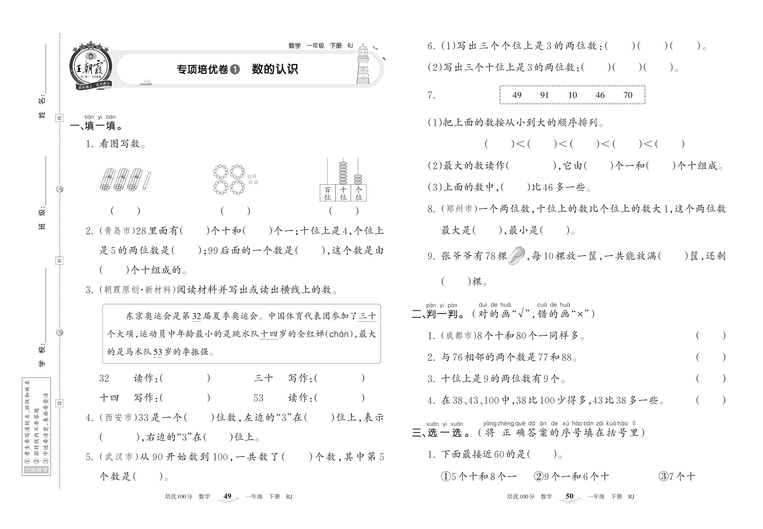 2022下册一年级数学人教版 专项培优卷1 数的认识