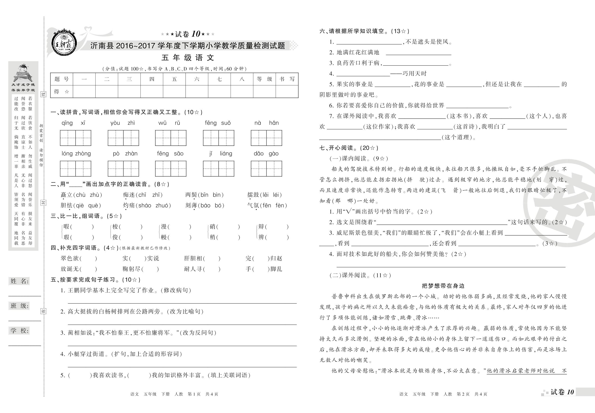 2016-2017学年第二学期临沂市沂南县五年级语文试卷(人教版)【10】