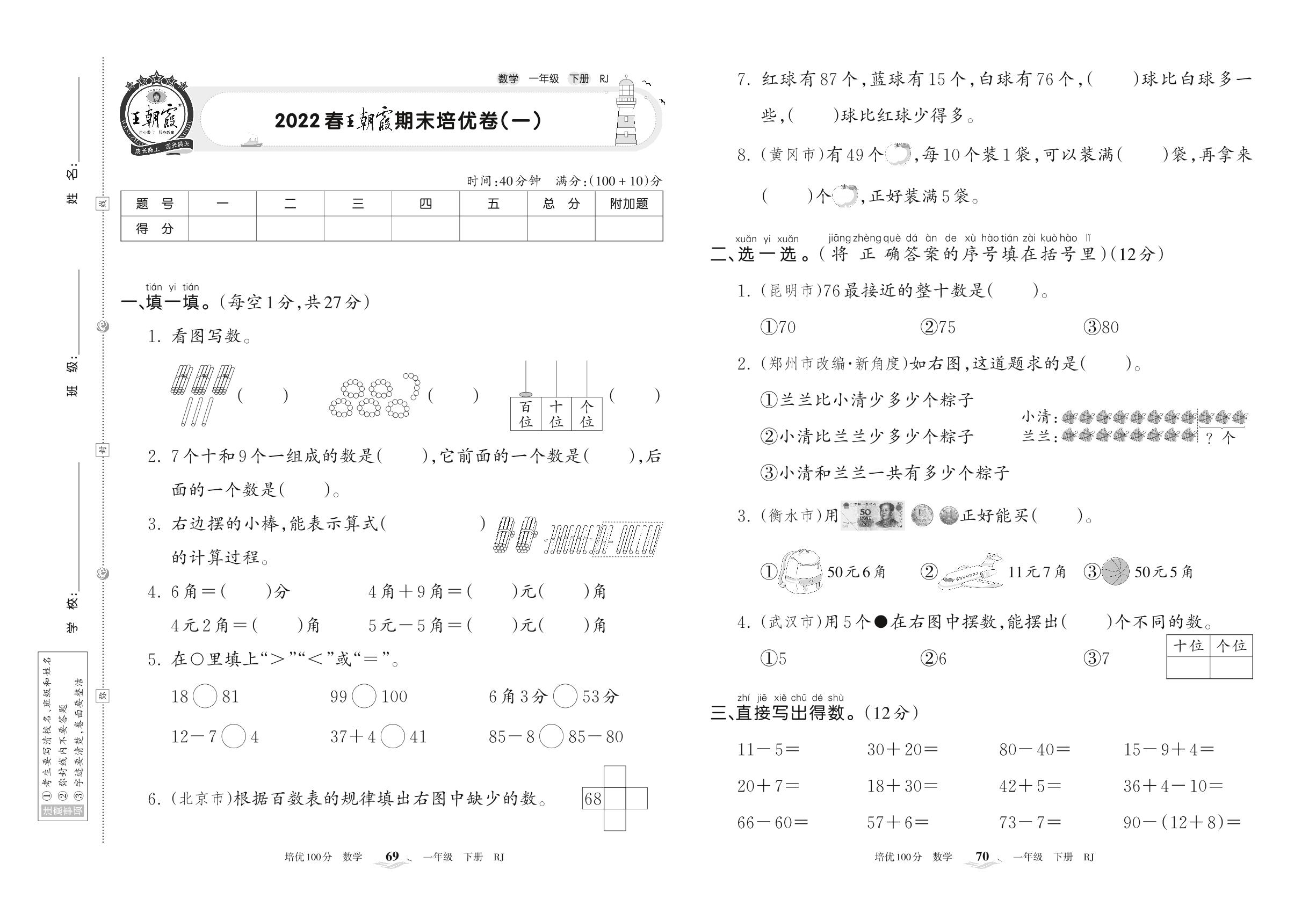 2022下册一年级数学人教版 王朝霞期末培优卷(一)