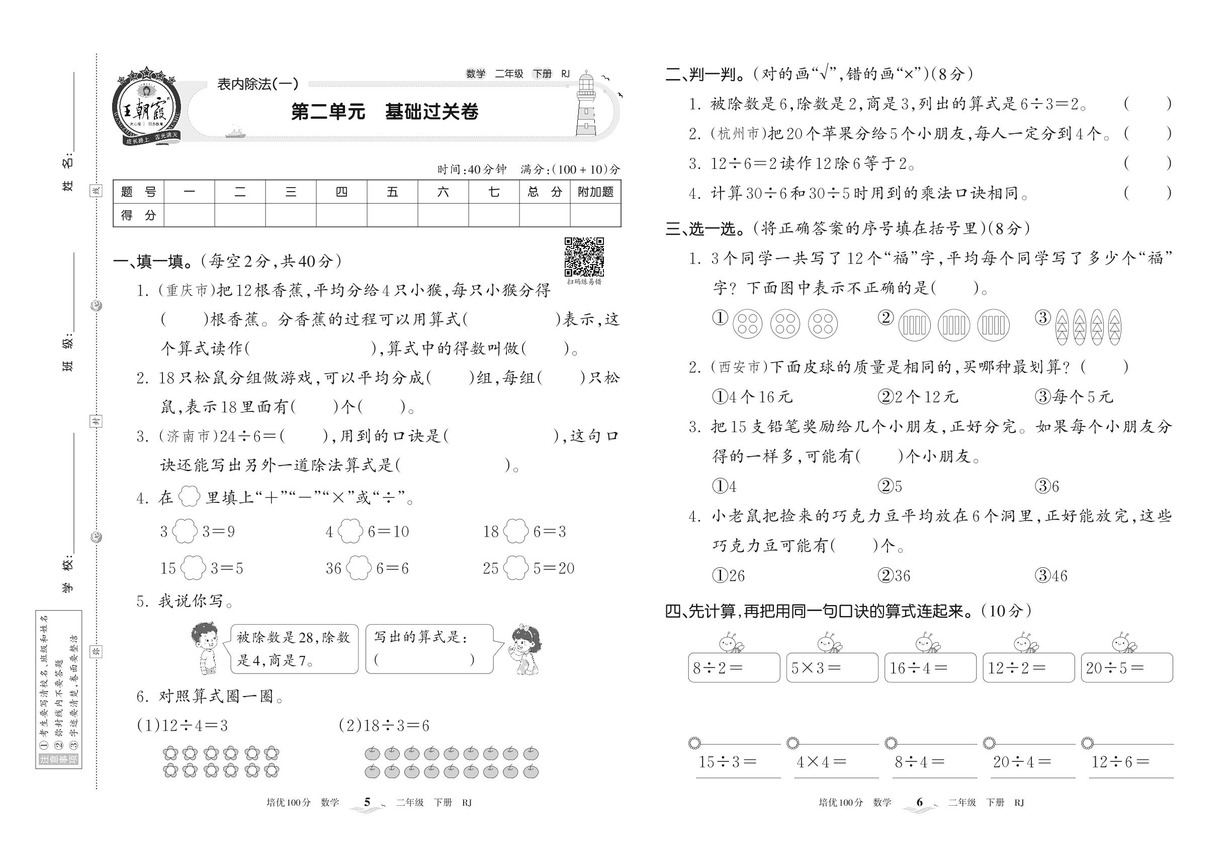 2022下册二年级数学人教版 第二单元 基础过关卷