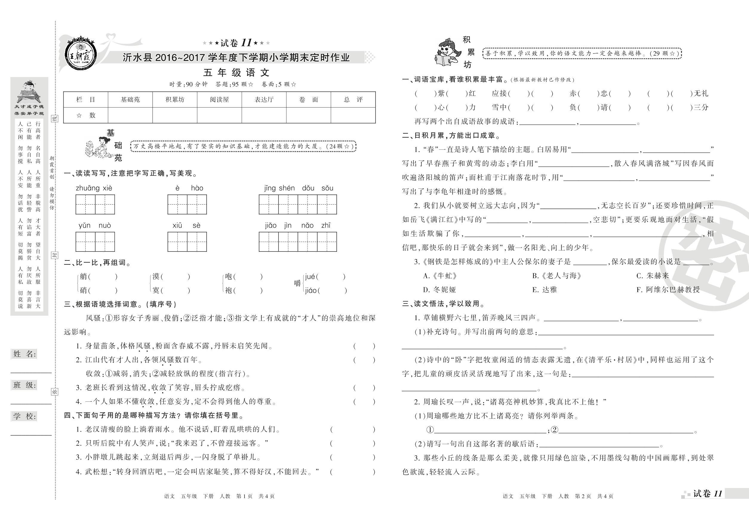 2016-2017学年第二学期临沂市沂水县五年级语文试卷(人教版)【11】
