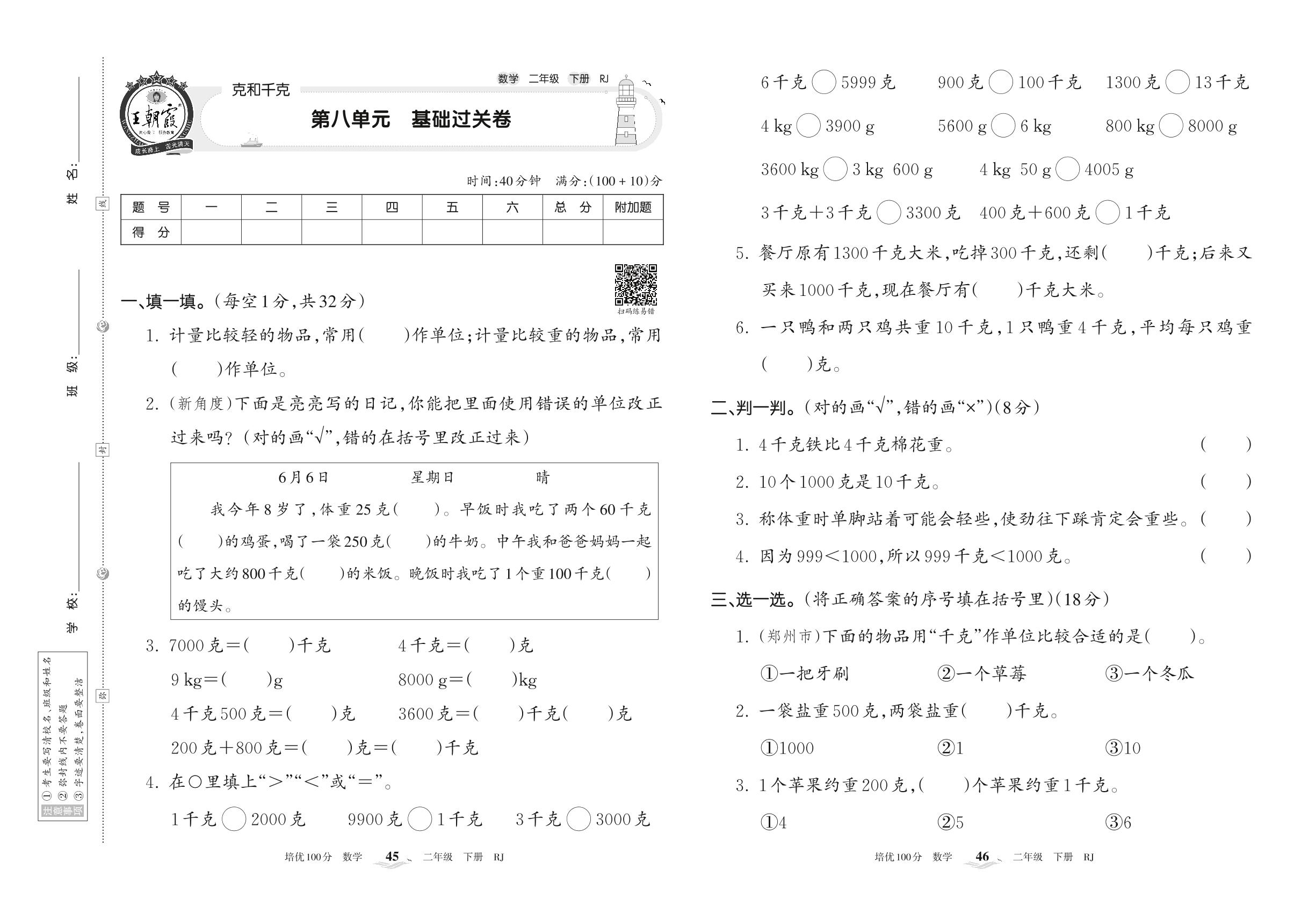 2022下册二年级数学人教版 第八单元 基础过关卷