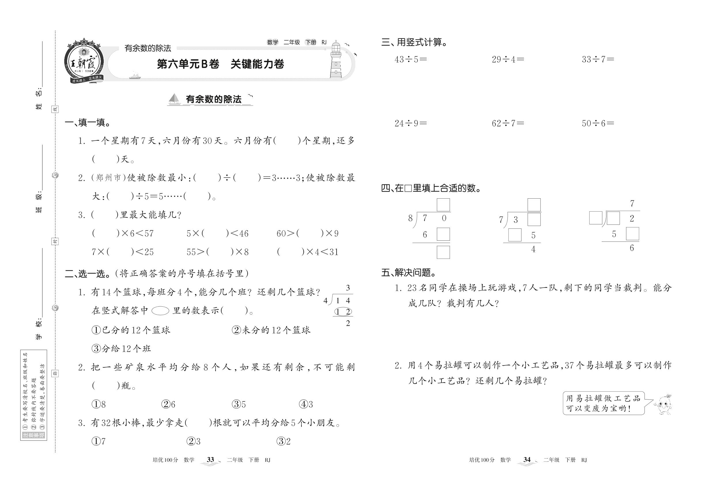 2022下册二年级数学人教版 第六单元B卷 关键能力卷