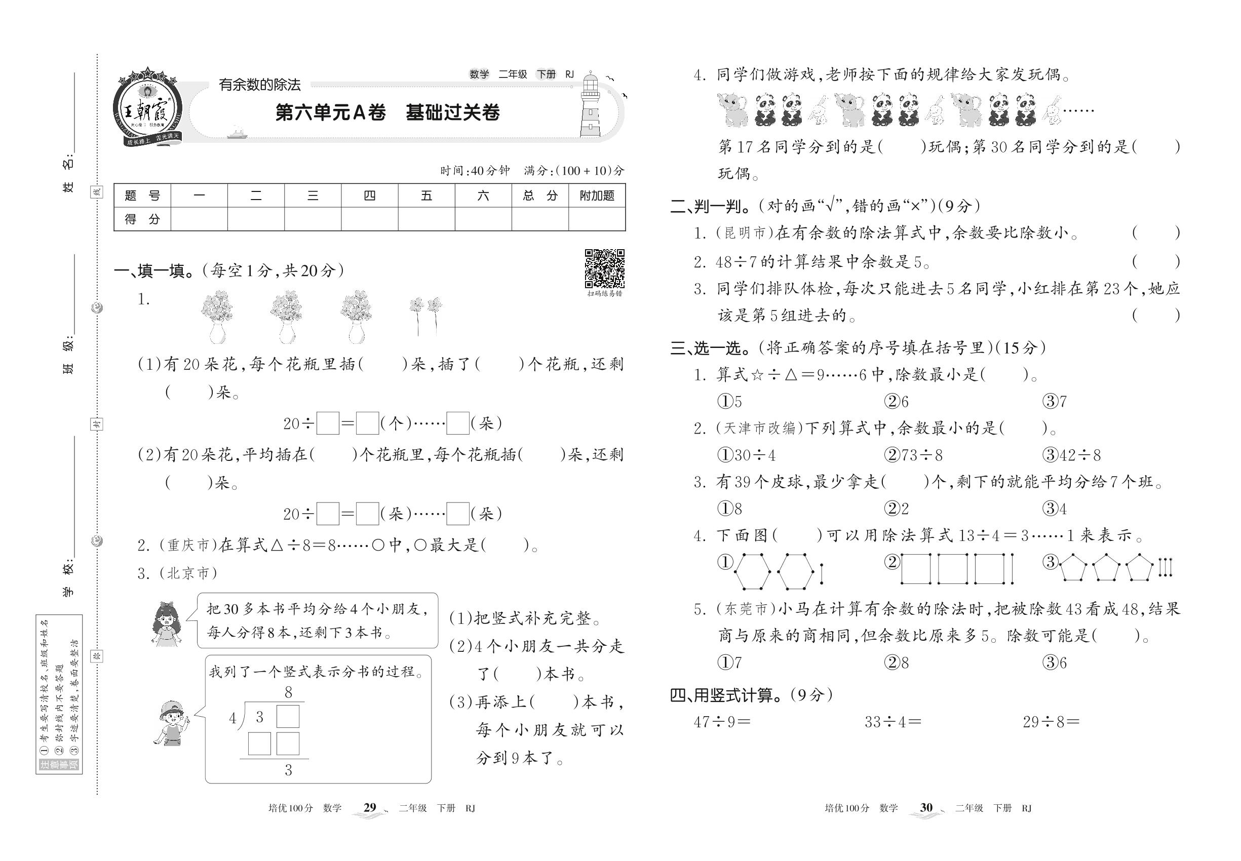 2022下册二年级数学人教版 第六单元A卷 基础过关卷
