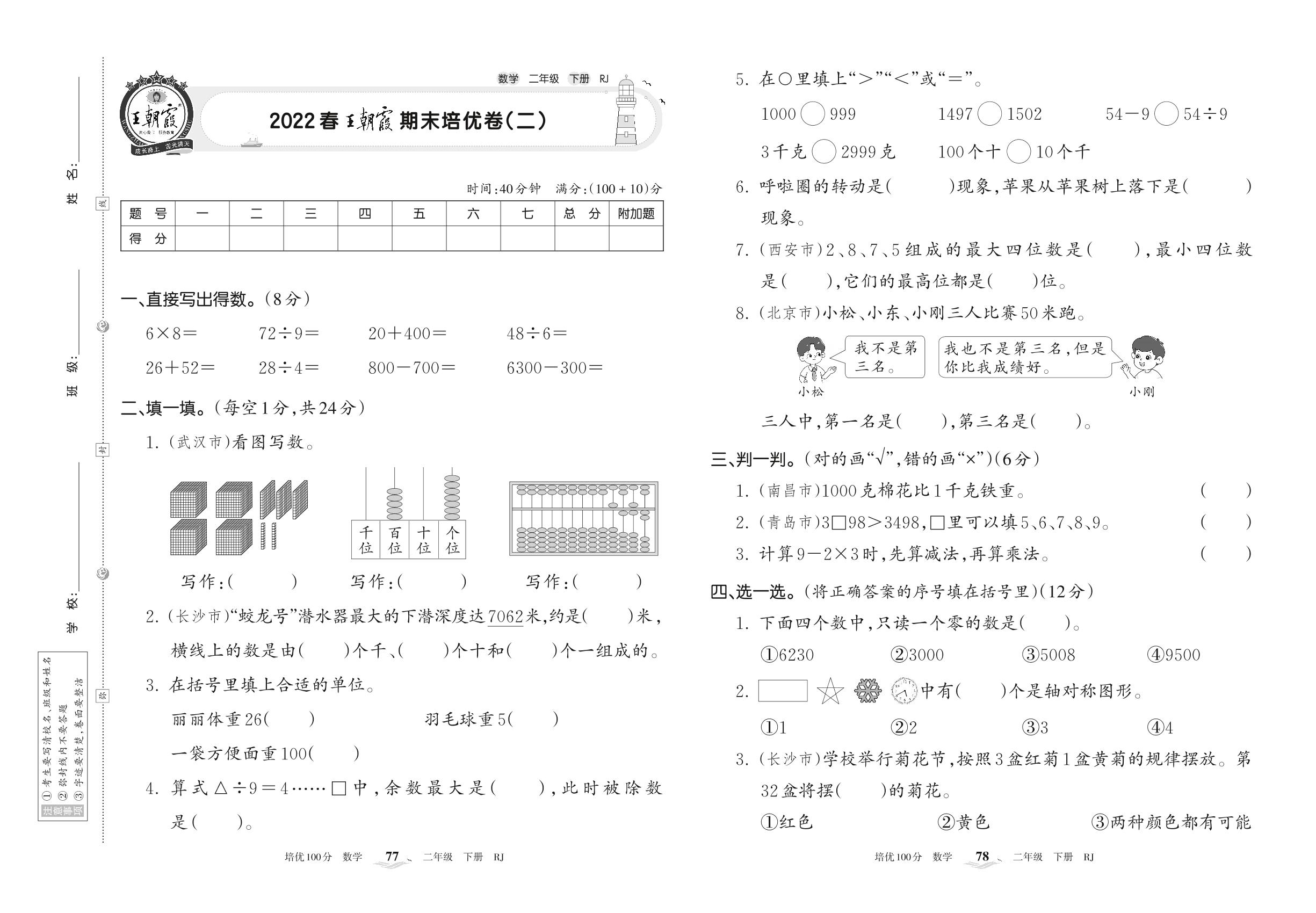 2022下册二年级数学人教版 王朝霞期末培优卷(二)