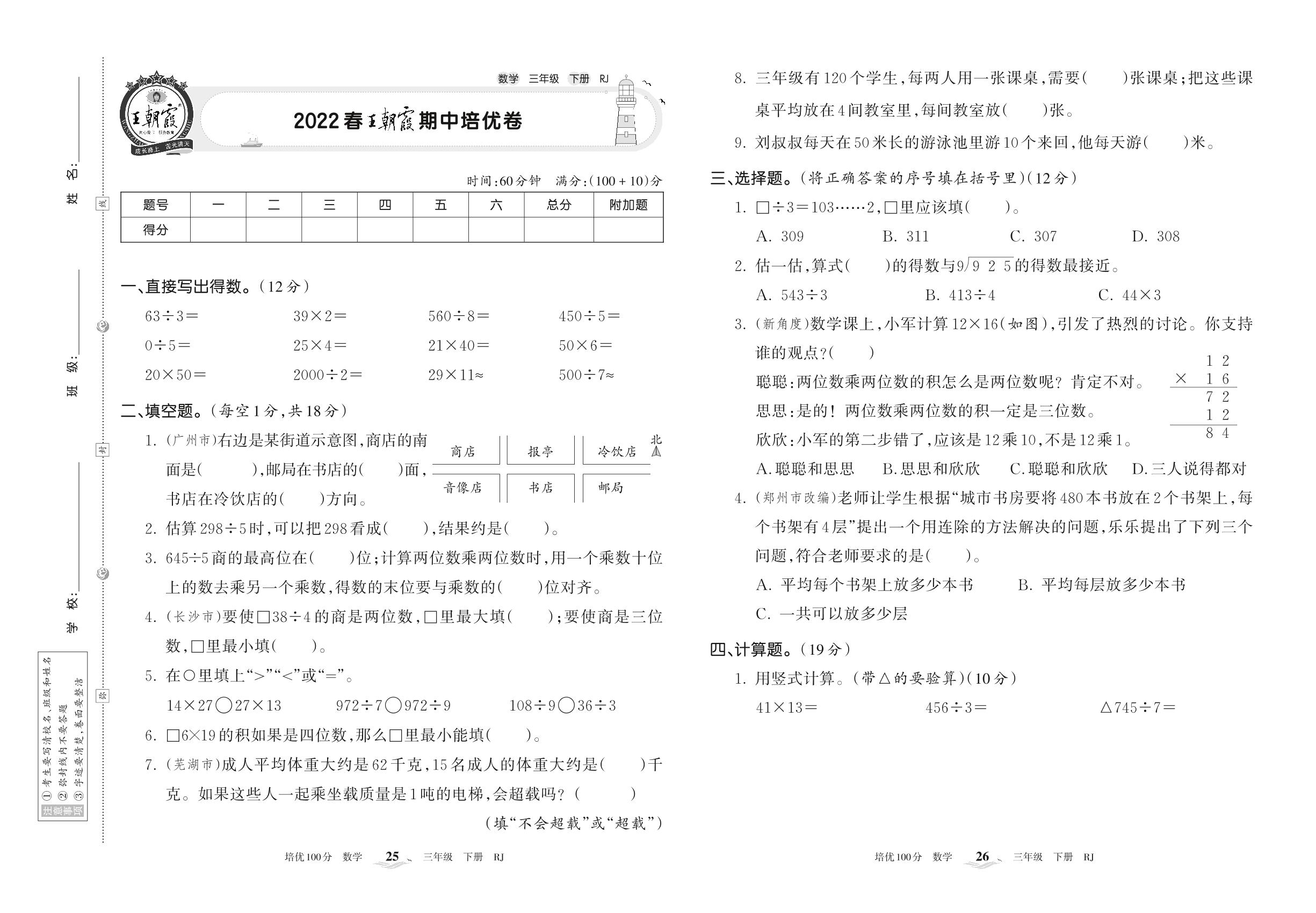 2022下册三年级数学人教版 王朝霞期中培优卷