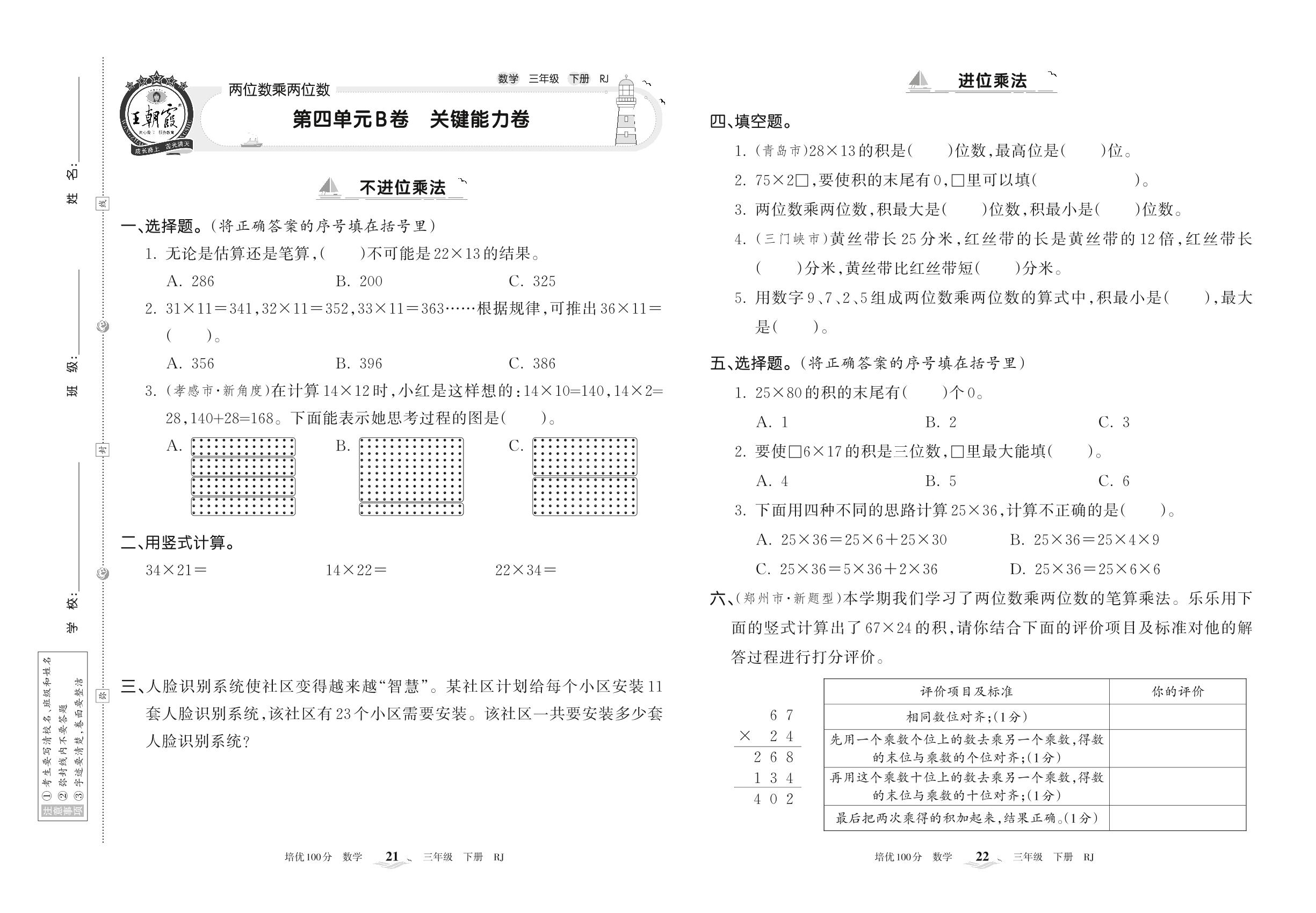 2022下册三年级数学人教版 第四单元B卷 关键能力卷