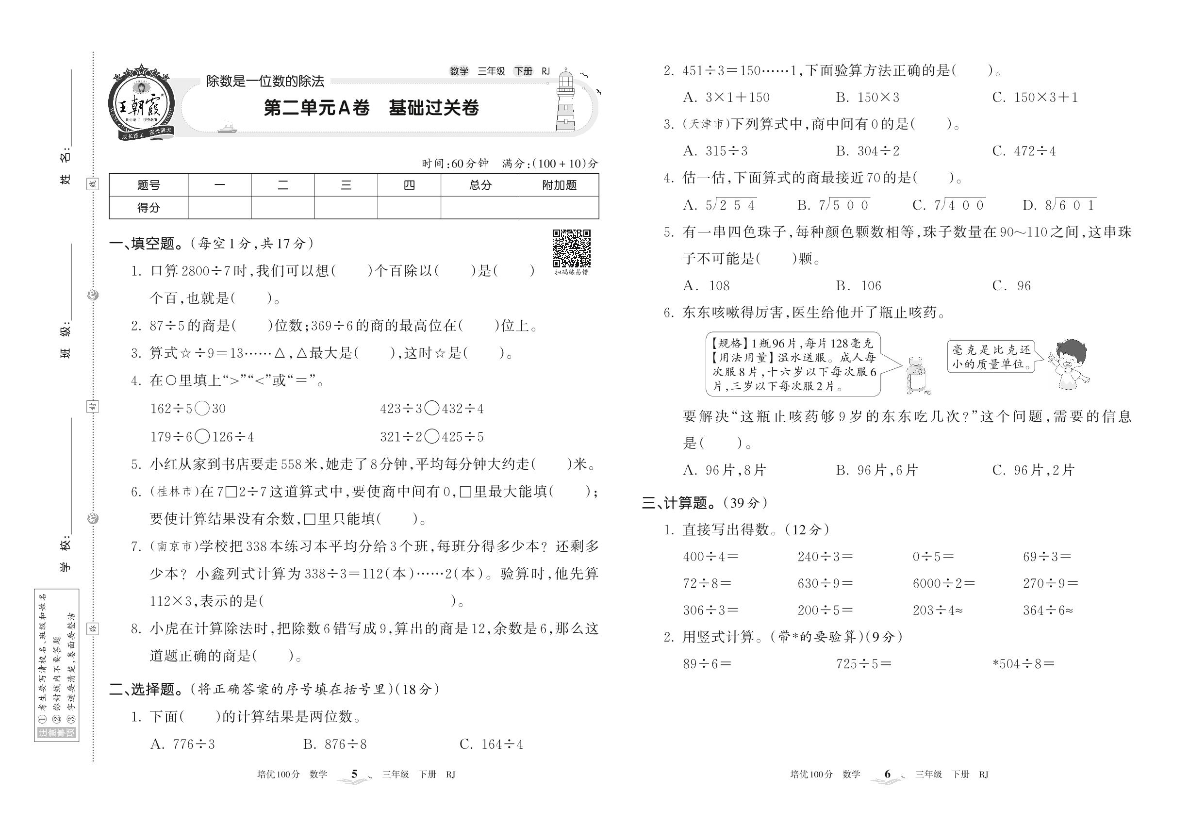 2022下册三年级数学人教版 第二单元A卷 基础过关卷