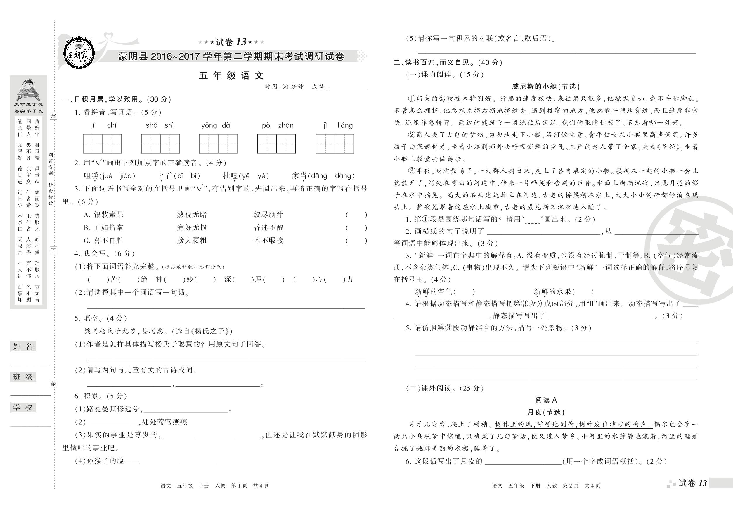 2016-2017学年第二学期临沂市蒙阴县五年级语文试卷(人教版)【13】