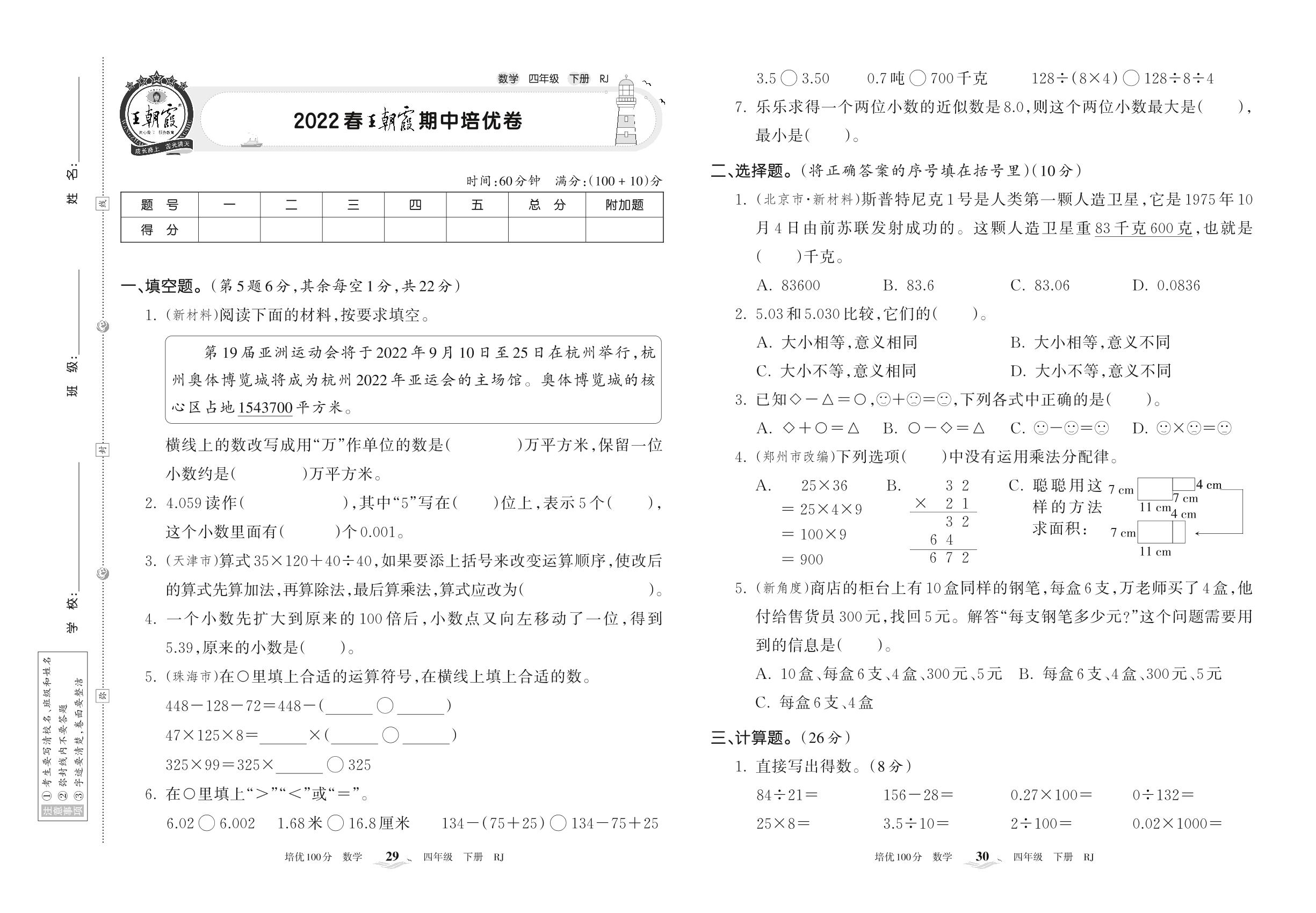 2022下册四年级数学人教版 王朝霞期中培优卷
