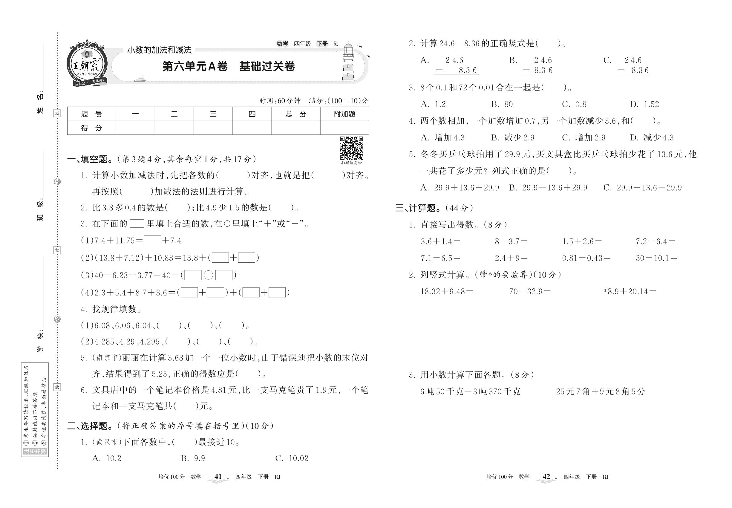 2022下册四年级数学人教版 第六单元A卷 基础过关卷