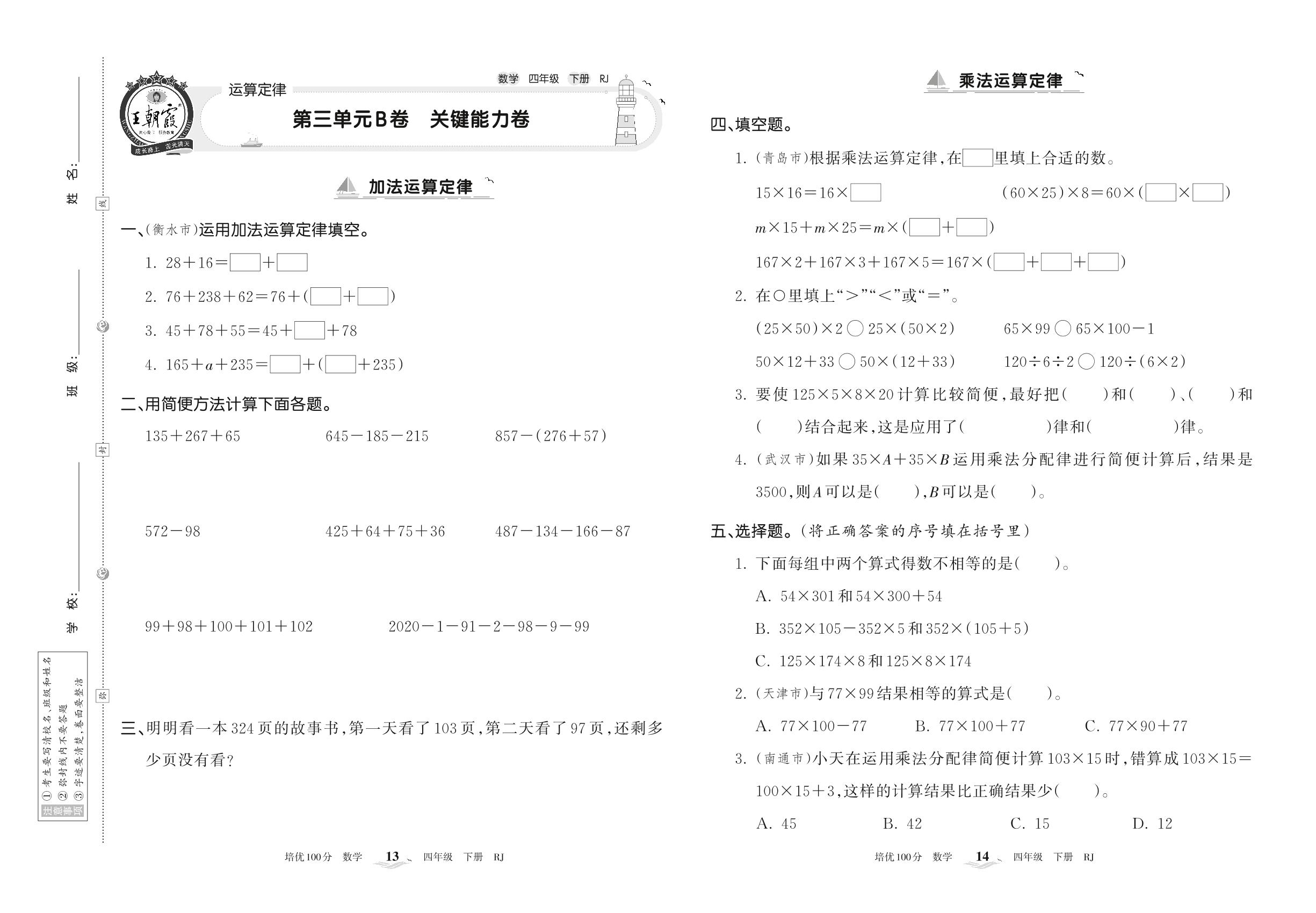 2022下册四年级数学人教版 第三单元B卷 关键能力卷