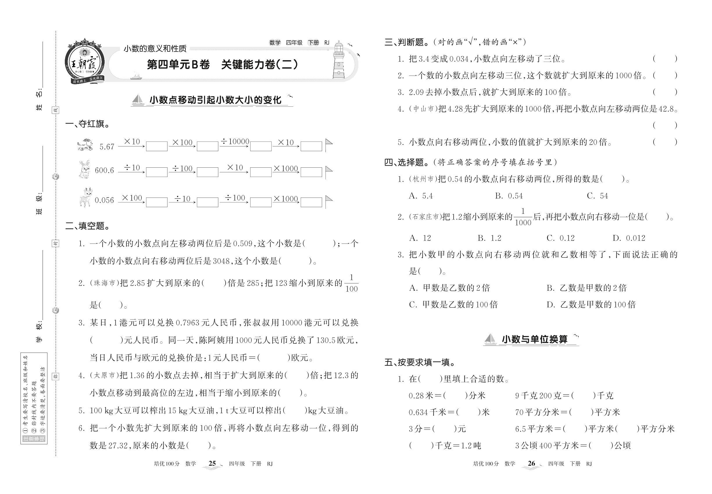 2022下册四年级数学人教版 第四单元B卷 关键能力卷(二)