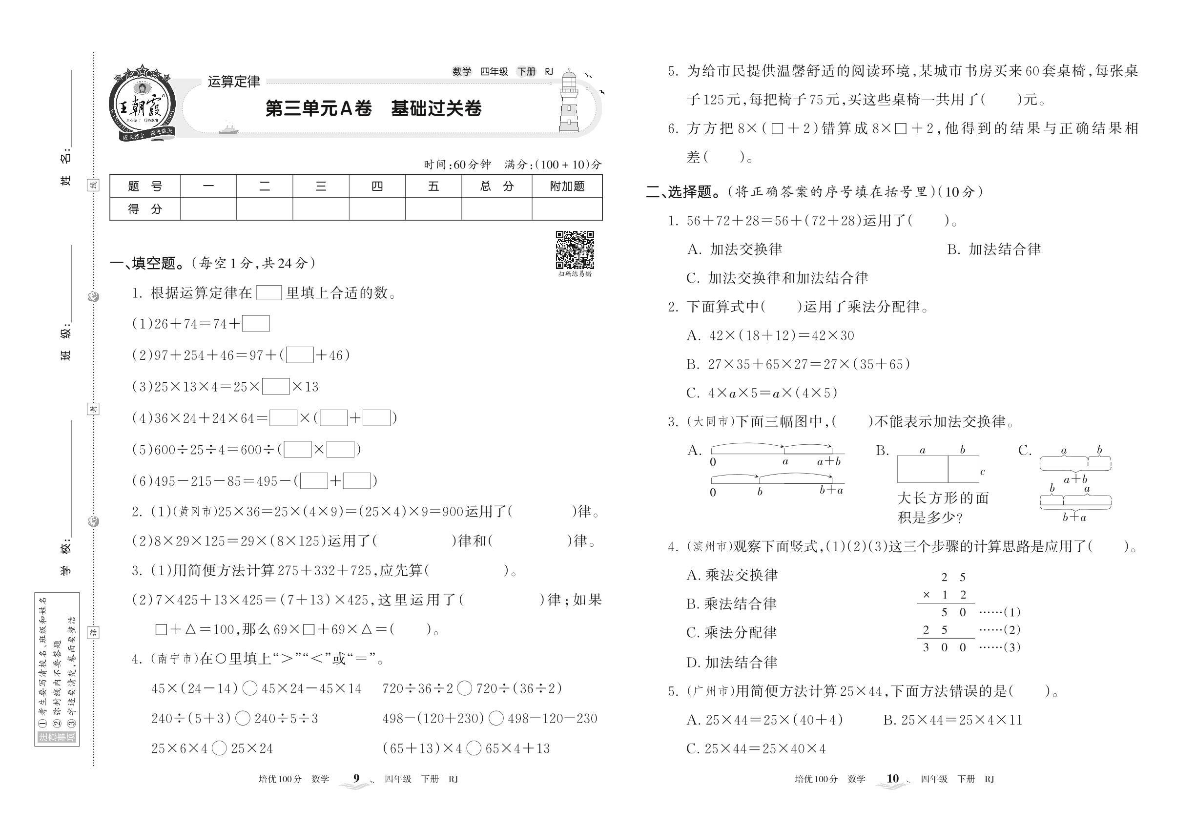 2022下册四年级数学人教版 第三单元A卷 基础过关卷