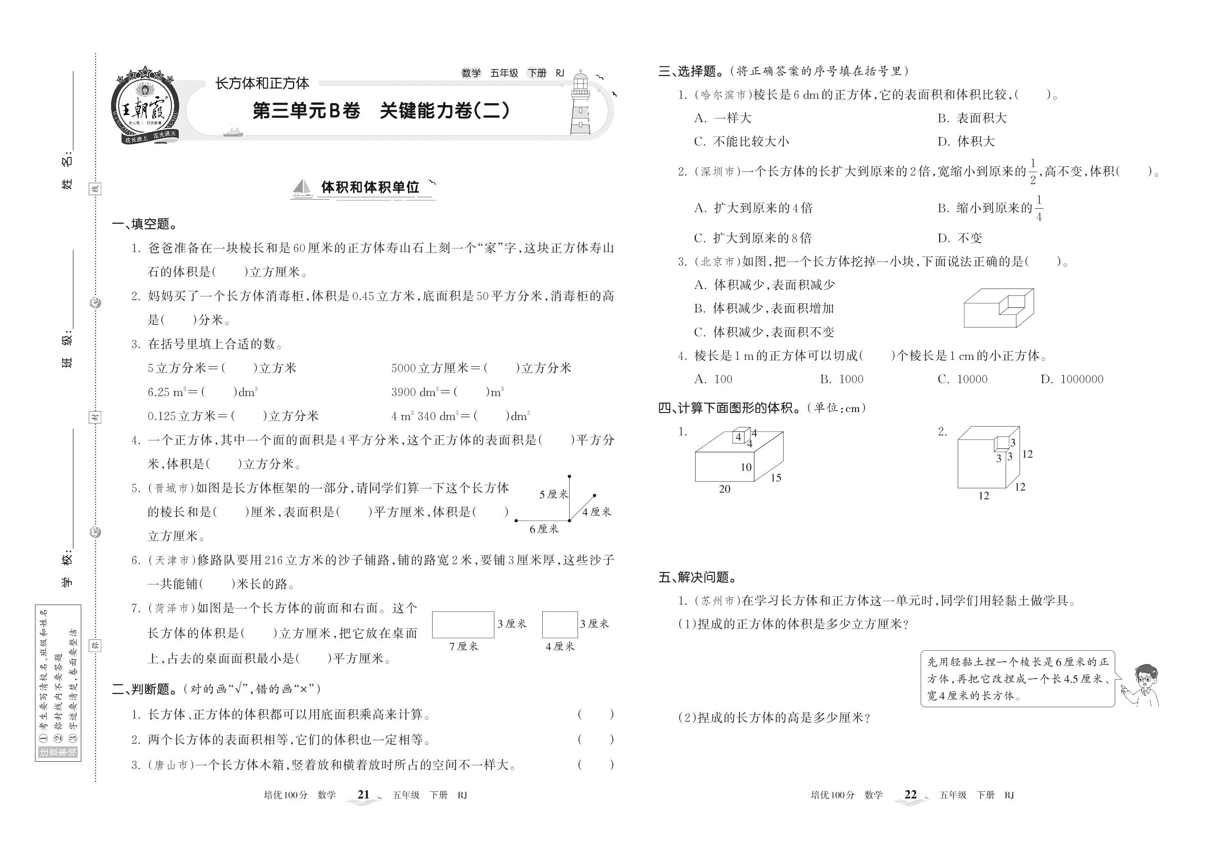 2022下册五年级数学人教版 第三单元B卷 关键能力卷(二)