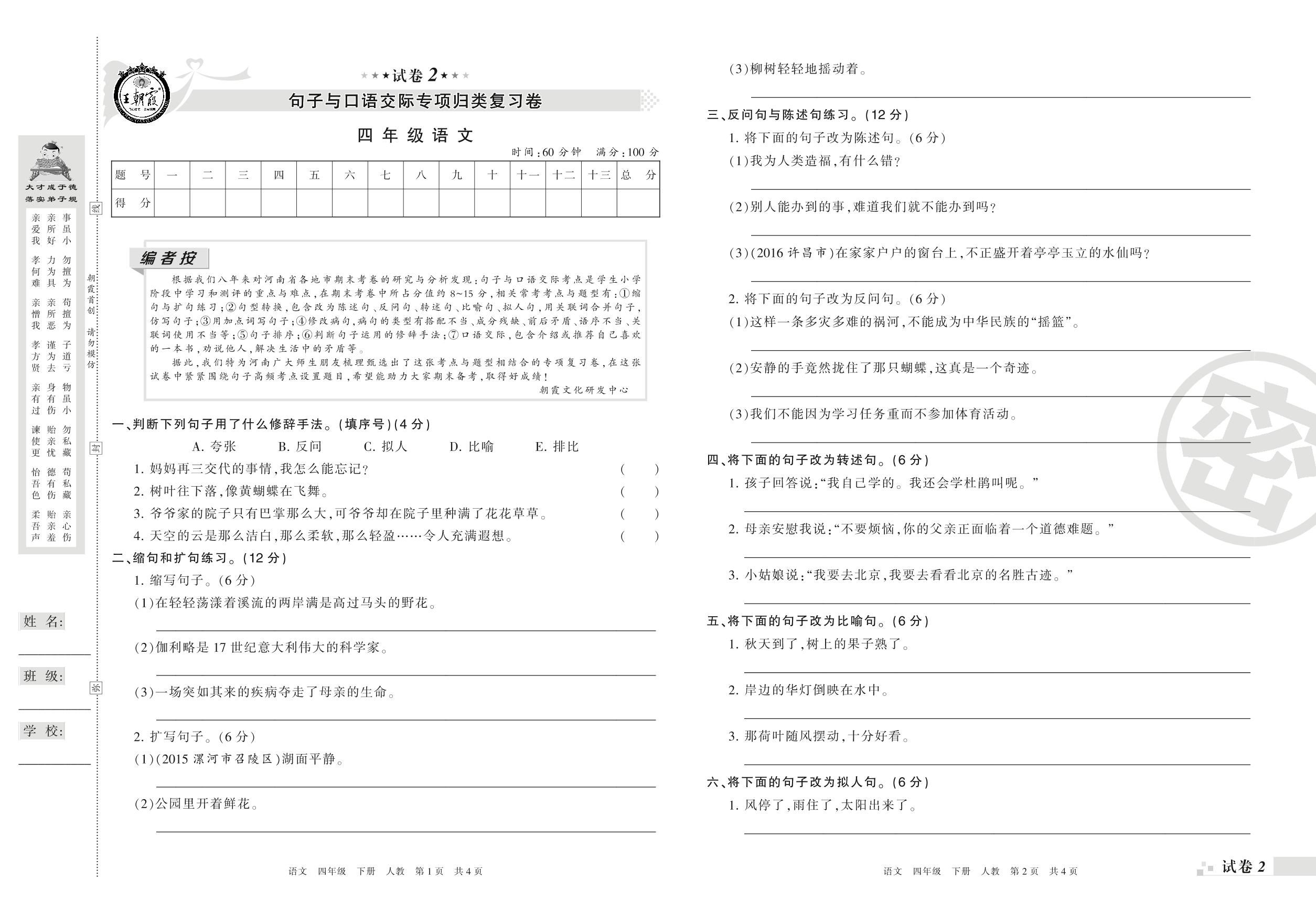 王朝霞期末专项卷——句子与口语交际专项归类复习卷四年级下册语文(人教版)_R210801230048【2】