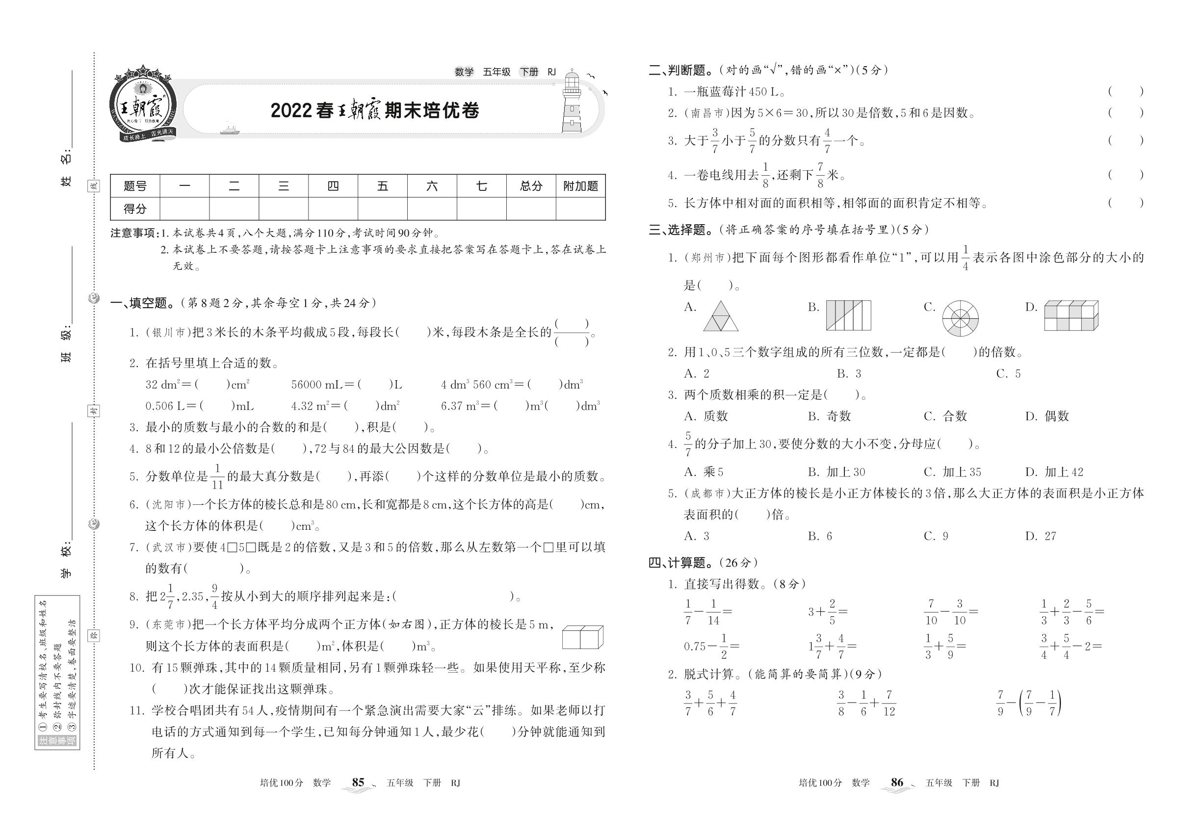 2022下册五年级数学人教版 王朝霞期末培优卷