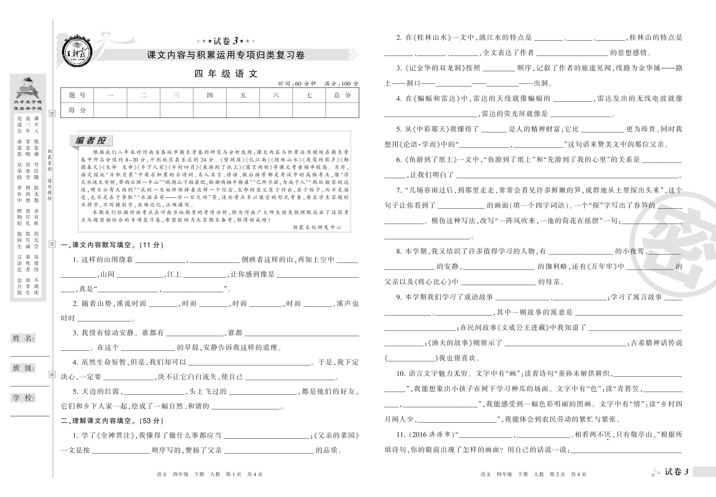 王朝霞期末专项卷——课文内容与积累运用专项归类复习卷四年级下册语文(人教版)_R210801230055【3】