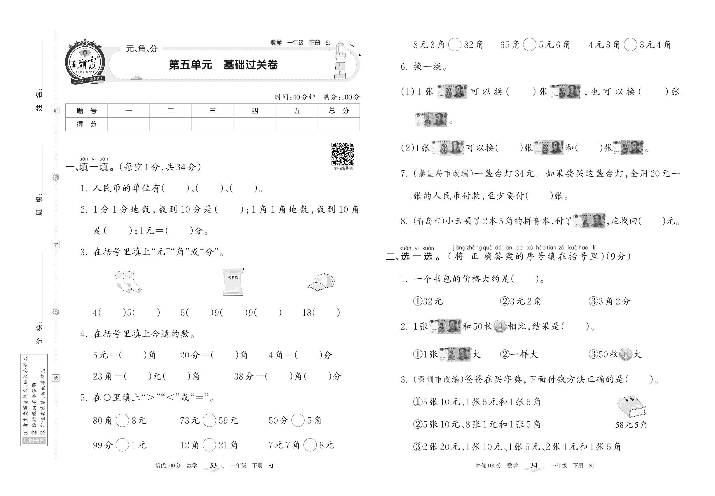 2022下册一年级数学苏教版 第五单元 基础过关卷