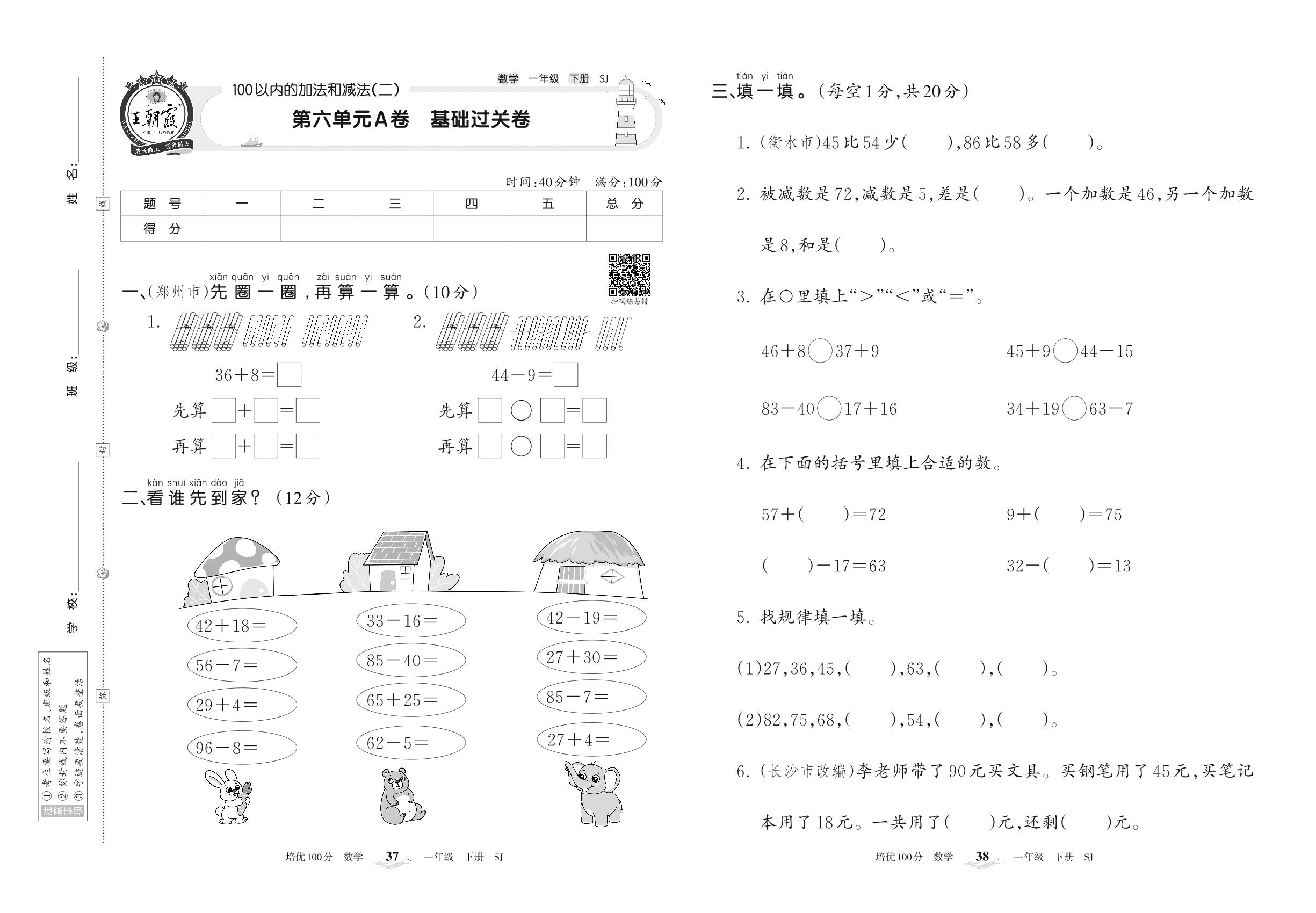 2022下册一年级数学苏教版 第六单元A卷 基础过关卷