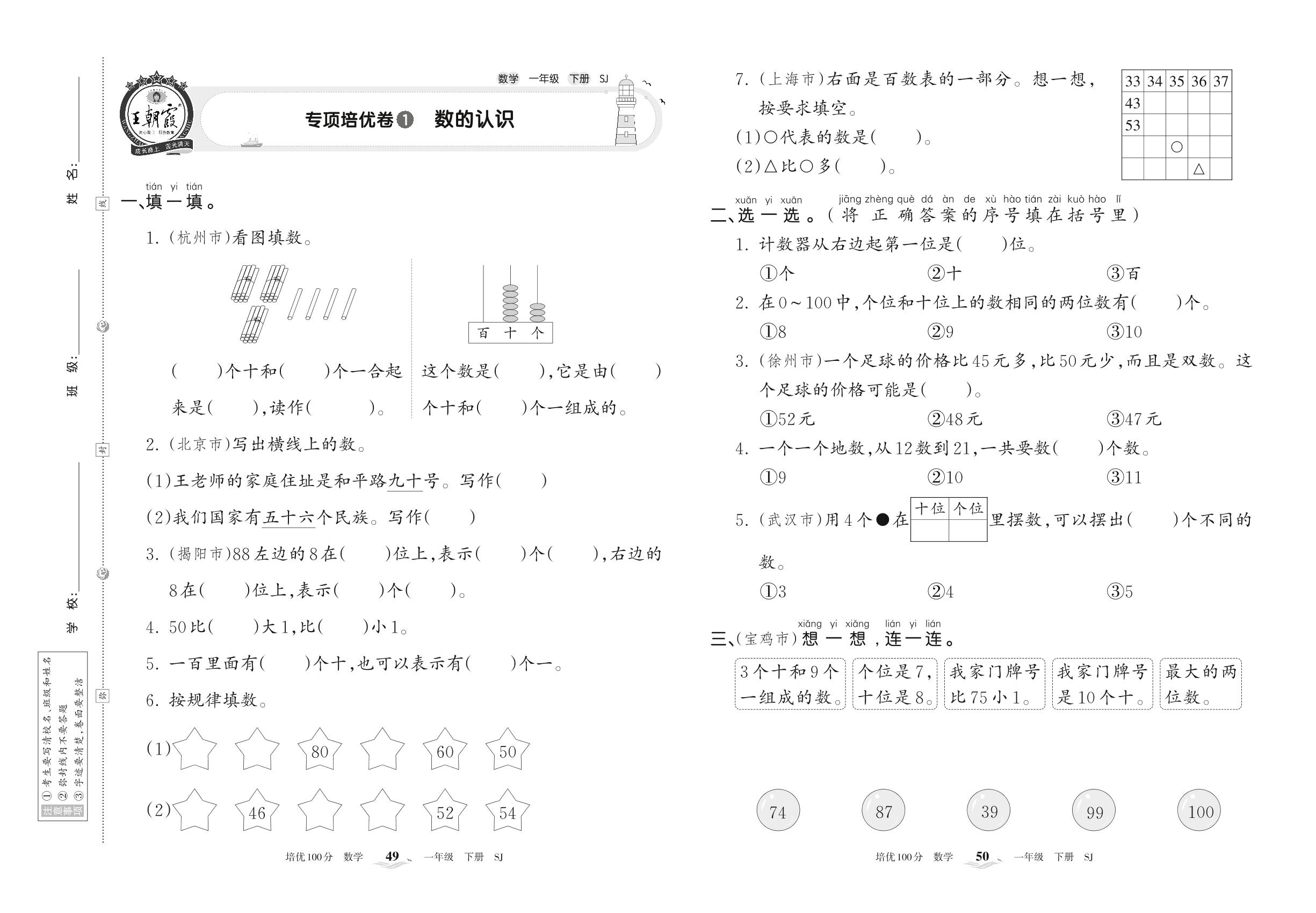 2022下册一年级数学苏教版 专项培优卷1 数的认识