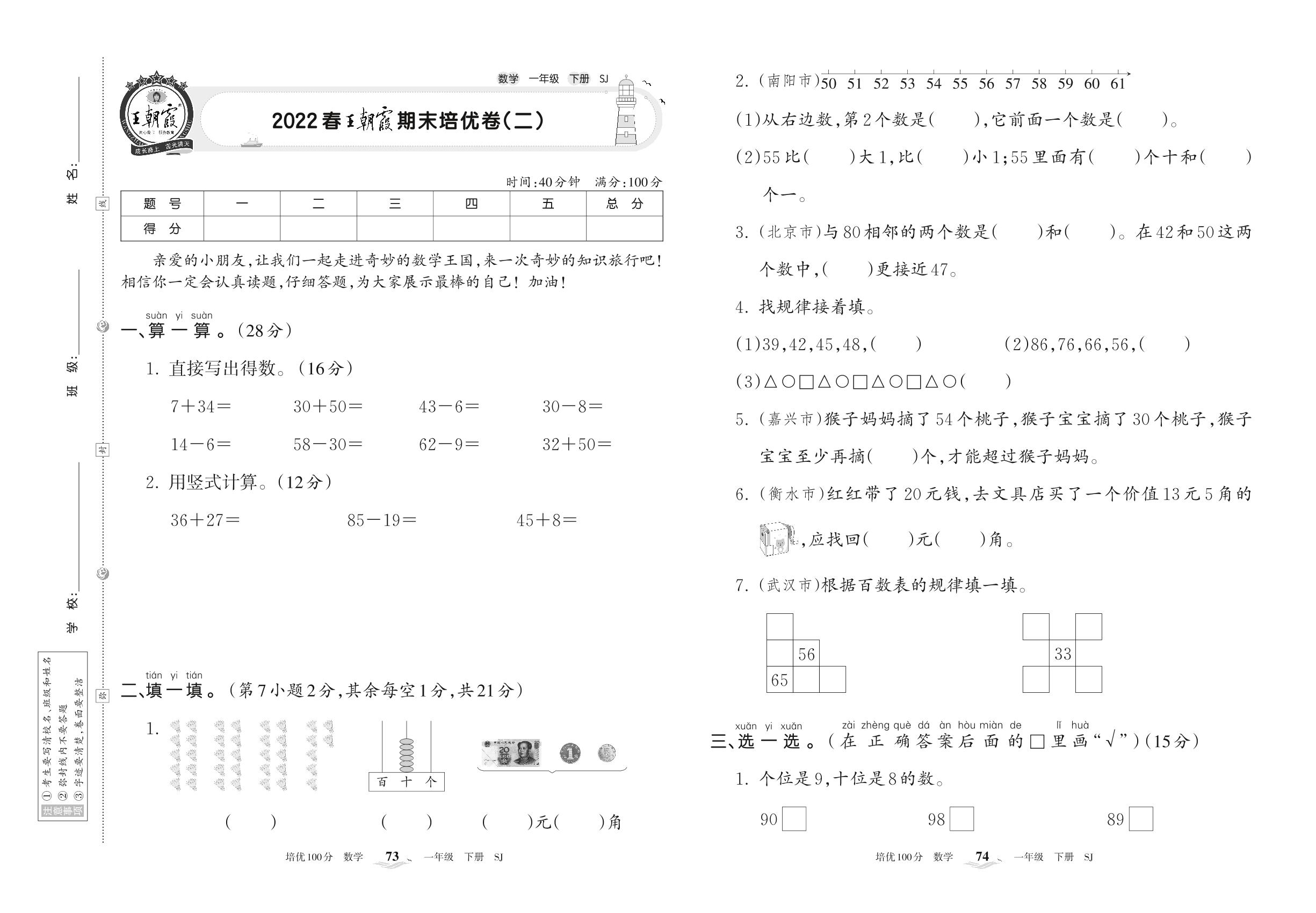 2022下册一年级数学苏教版 王朝霞期末培优卷(二)